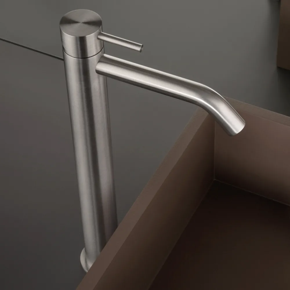 Hoher Waschtischmischer, langer Auslauf, ohne Ablaufgarnitur aus Edelstahl AISI 316L , 100 % recycelbares Material, vollständig in Italien hergestellt.