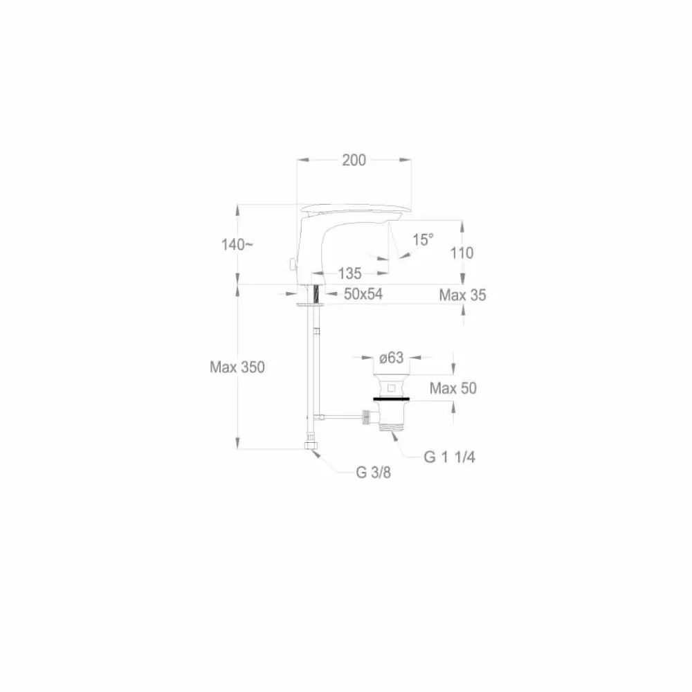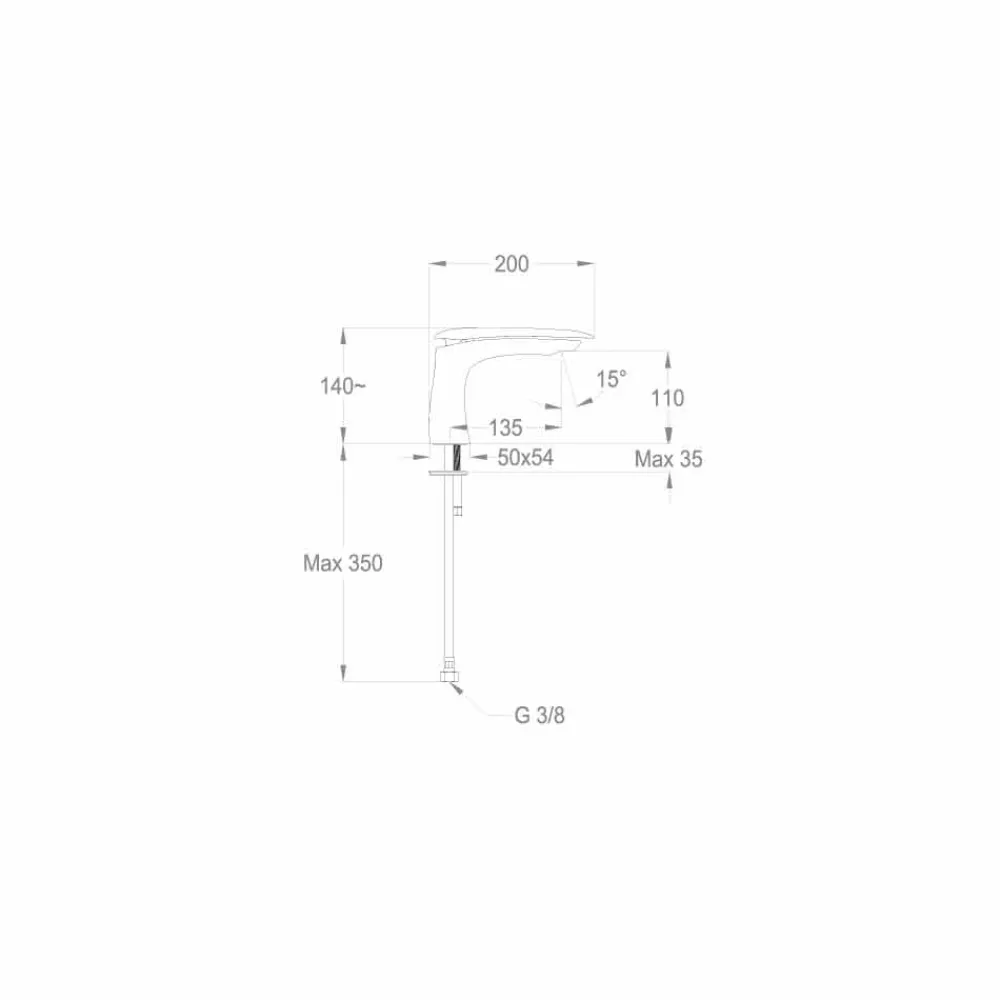 Waschtischmischer mit einem hochmodernen und avantgardistischen Design von 140 mm Höhe und einem Achsabstand von 135 mm.