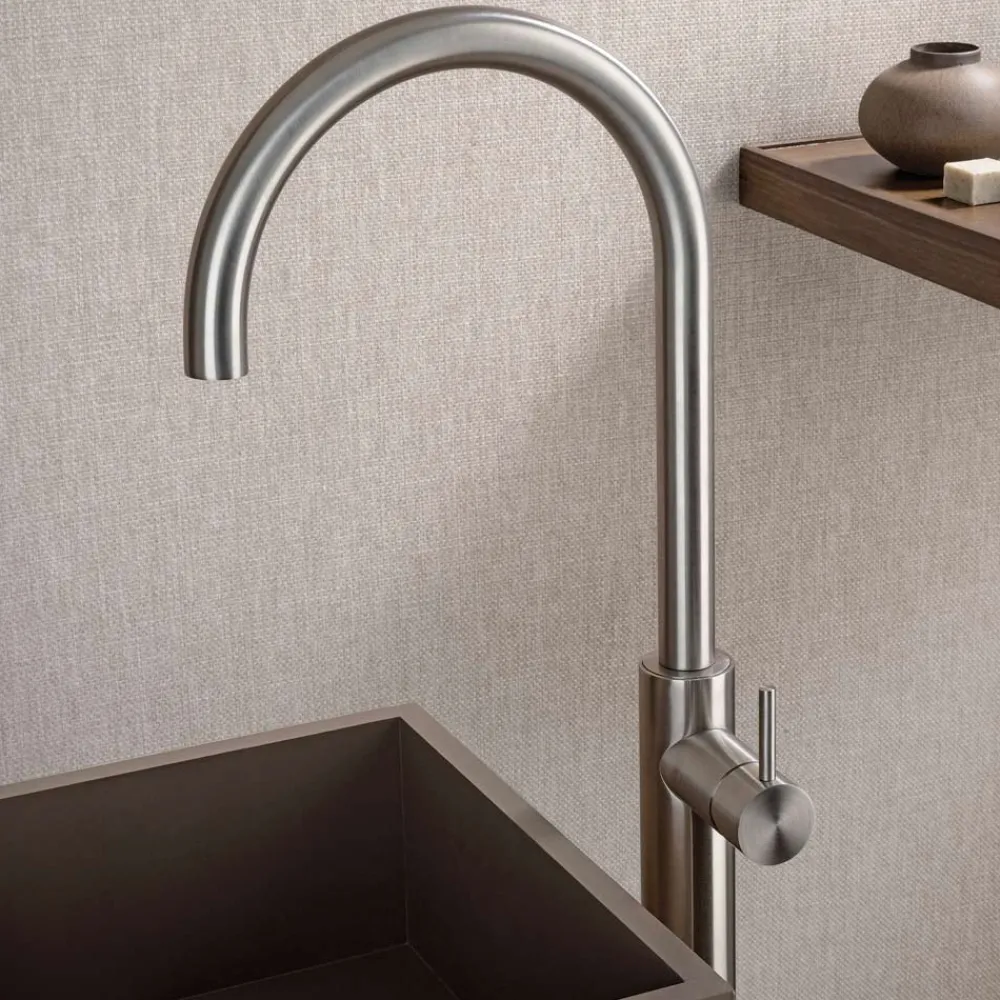 Bodenstehender Waschtischmischer mit hohem, schwenkbarem Auslauf aus Edelstahl , komplett Made in Italy.