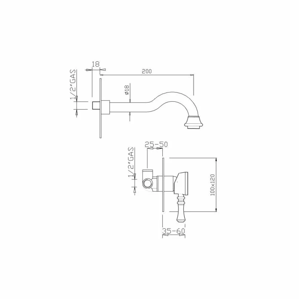 Wandmontierter Waschtischmischer aus Messing. Hergestellt in Italien.
