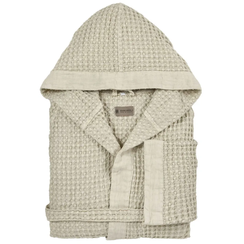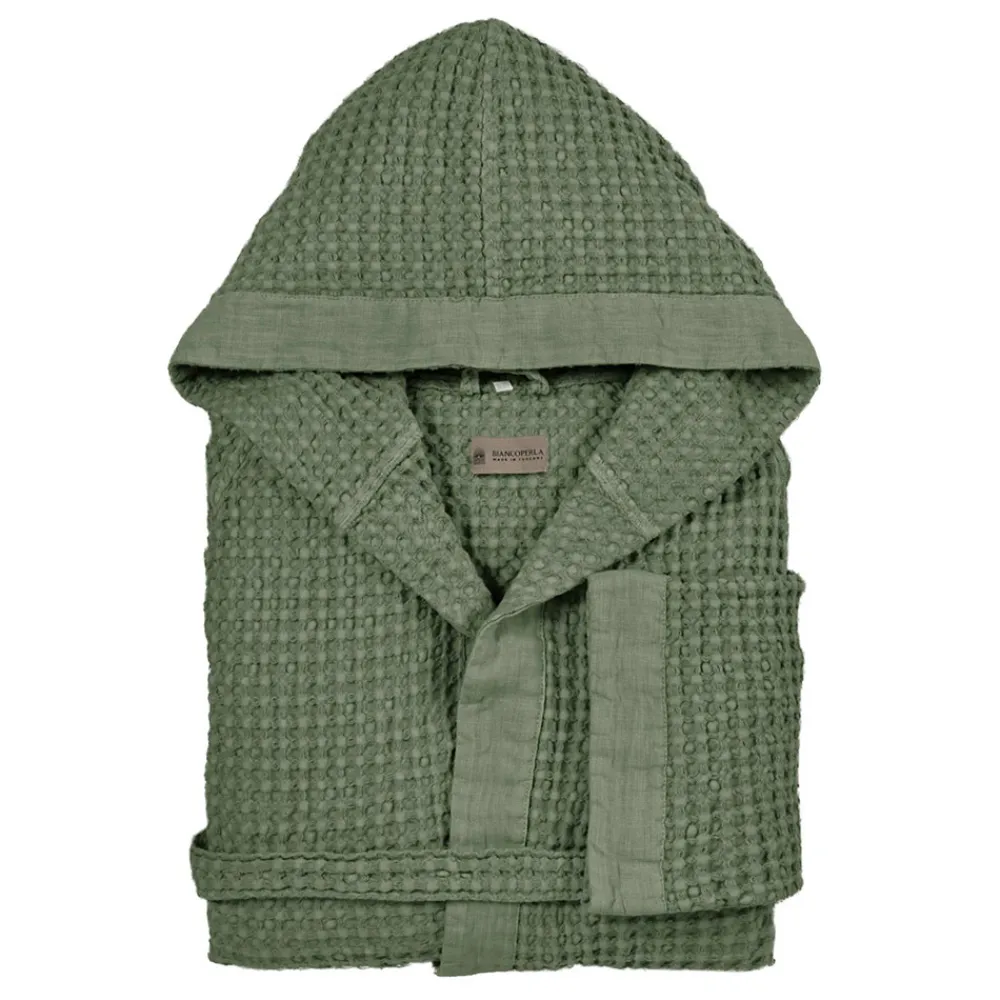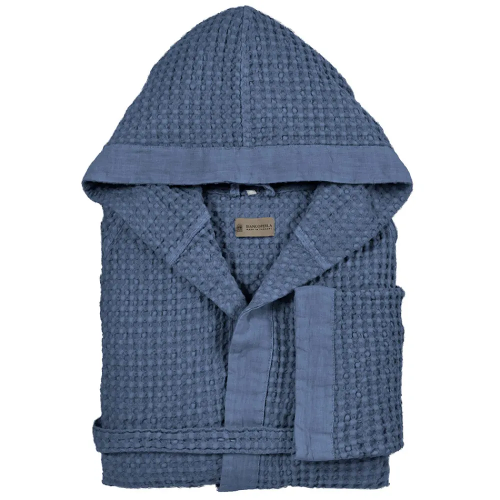 Bademantel mit Kapuze aus Baumwollwabengewebe mit Leinenvolant, komplett stückgefärbt. Das zerknitterte und abgenutzte Gefühl des Stoffes ist das Wesen der Stückfärbetechnik und die erzielten Farbtöne sind unwiederholbar: Das gleiche Farbbad kann tatsächlich leicht unterschiedliche Nuancen erzeugen, die Ihr Kleidungsstück einzigartig und exklusiv machen. Dieser Artikel wird in Italien nach der toskanischen Textilhandwerkstradition hergestellt und verpackt.