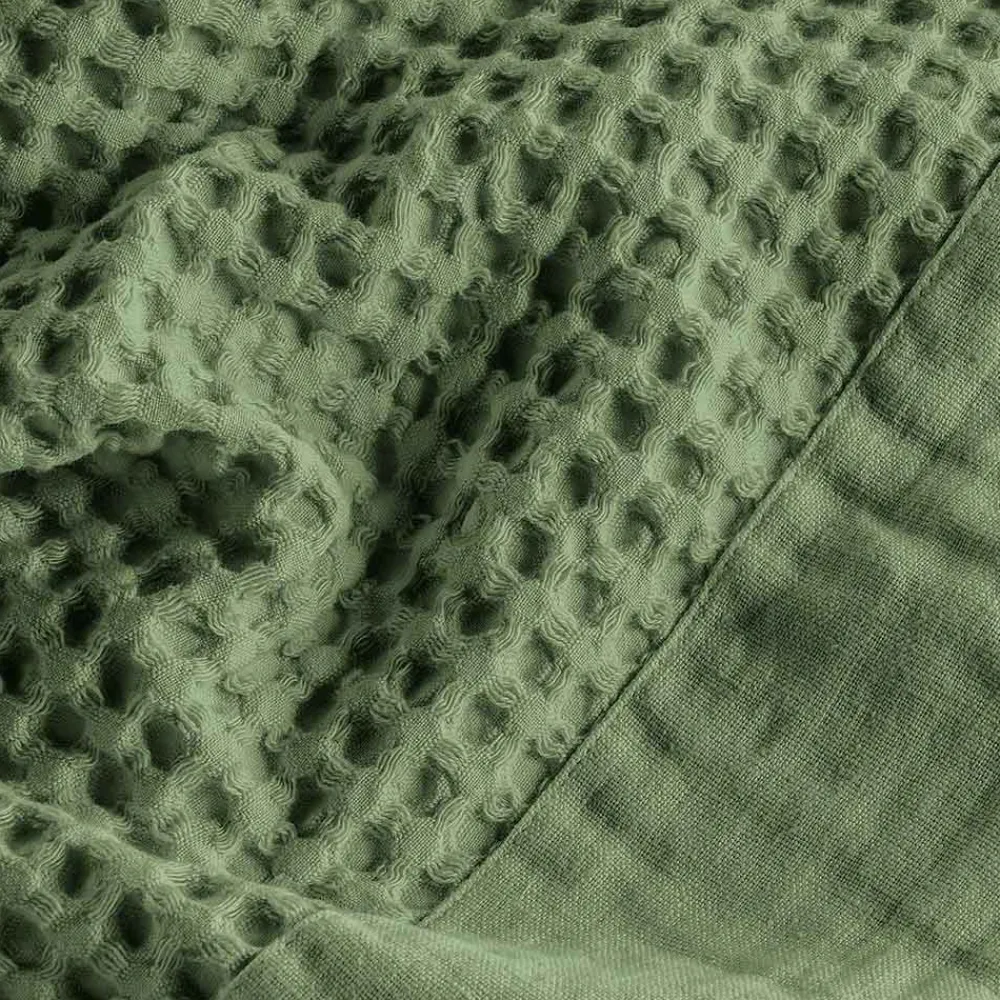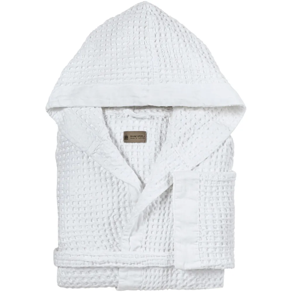 Bademantel aus Baumwollwabenmuster mit Kapuze und Leinenrüsche, komplett stückgefärbt