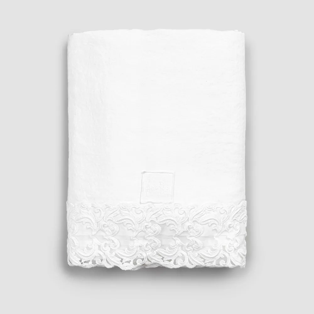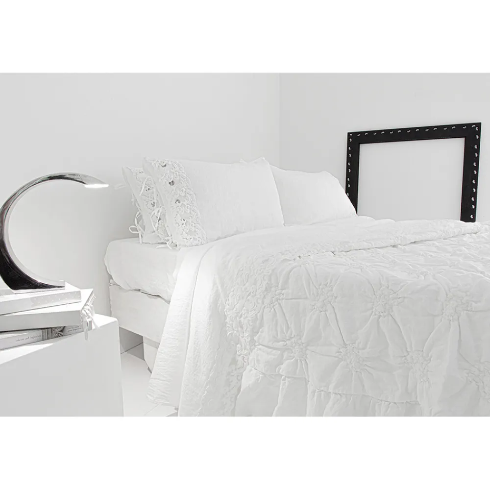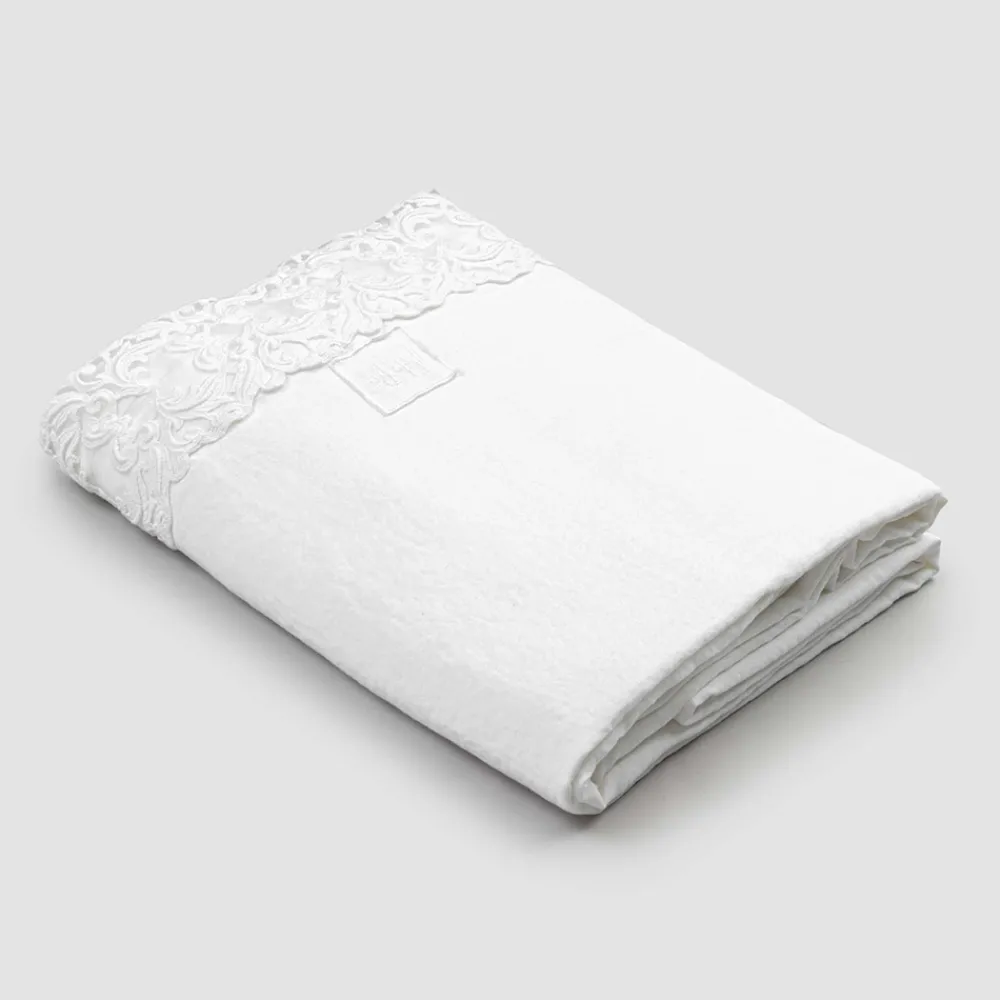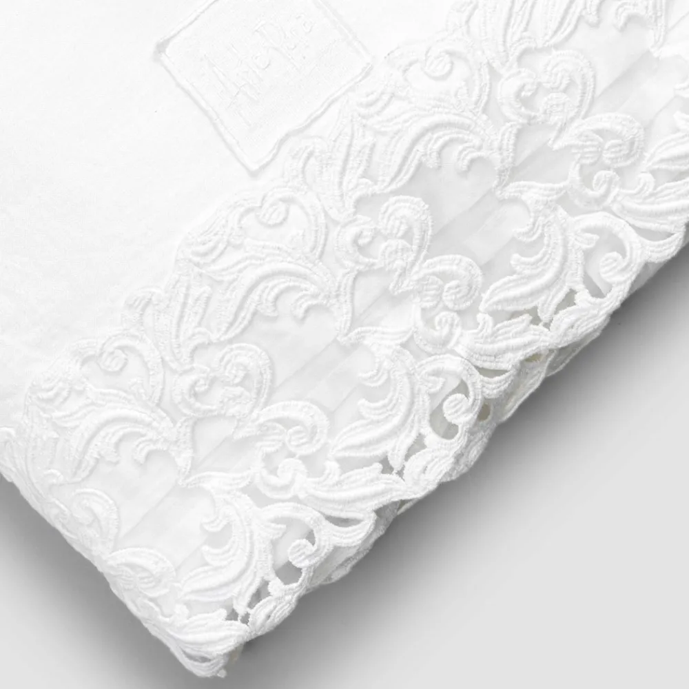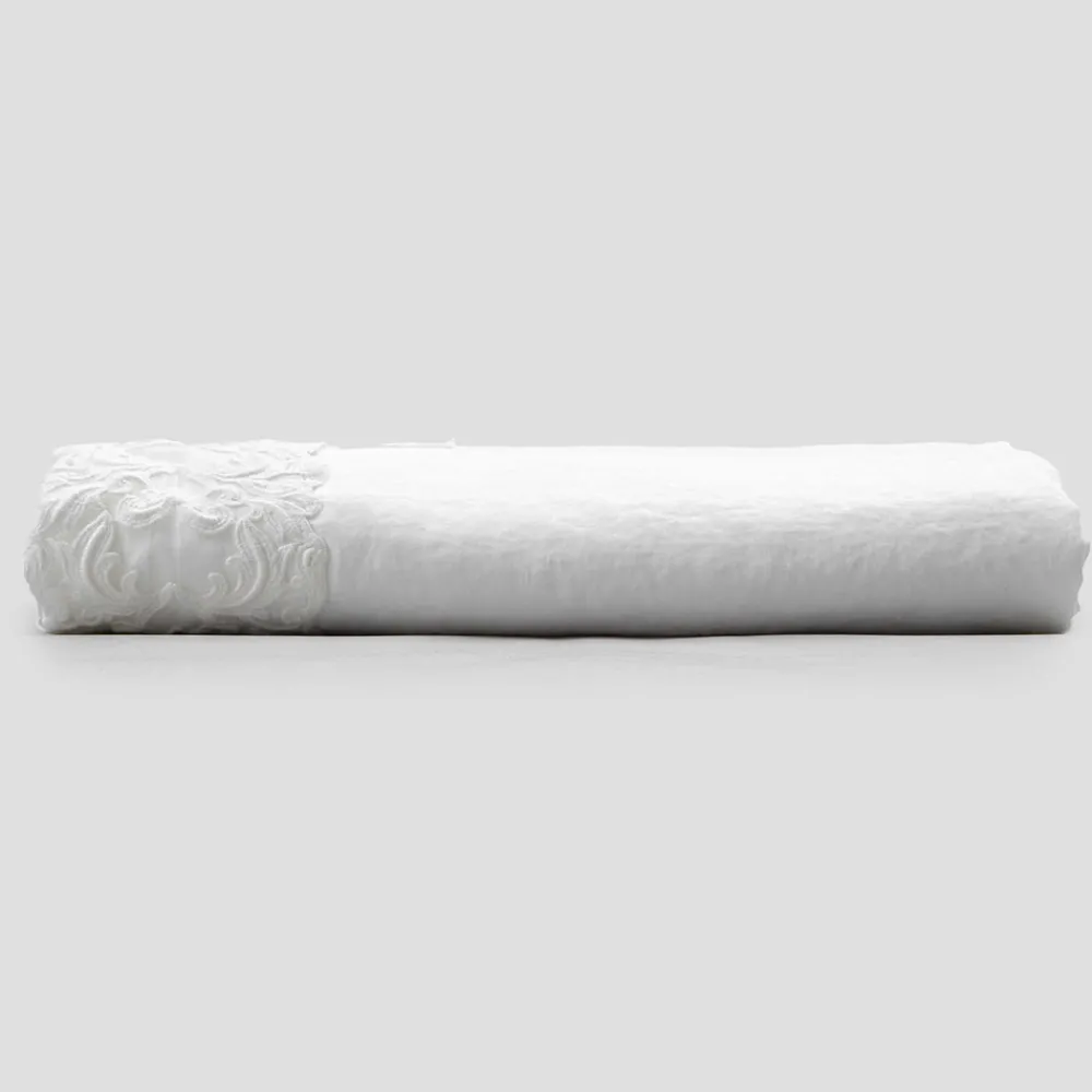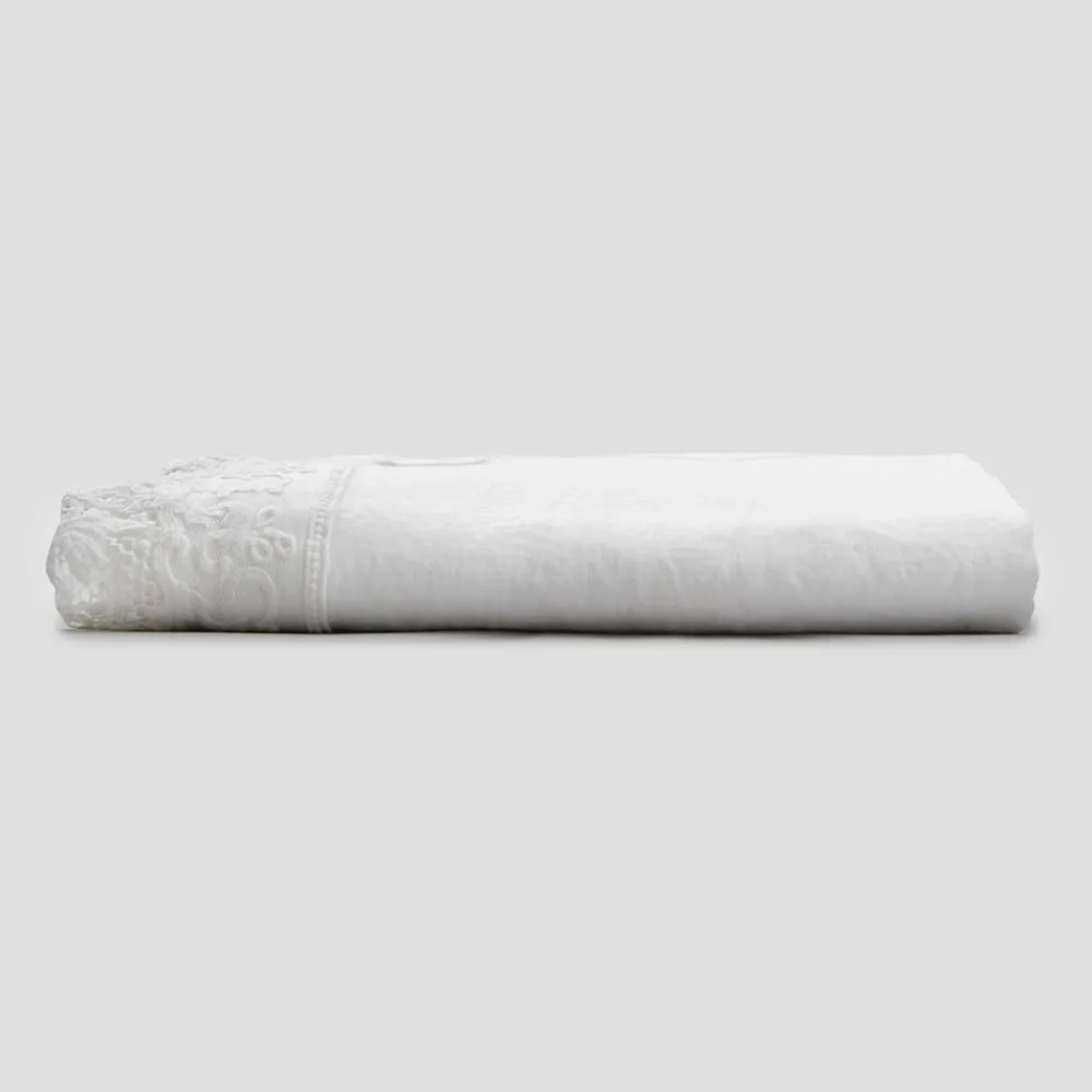 Bettlaken aus reinweißem Leinen mit verschiedenen Spitzen, luxuriöses Design, hergestellt in Italien.