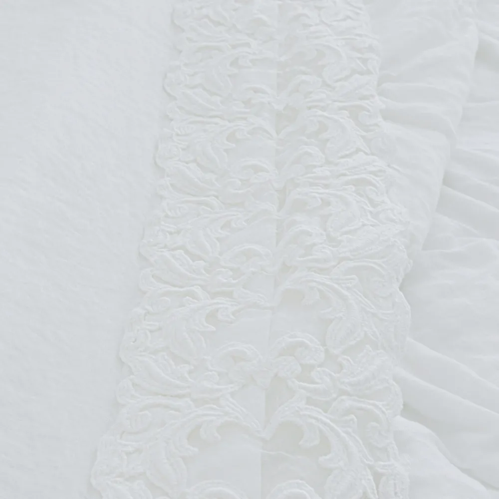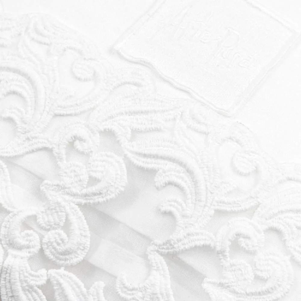 Der Wert der Tradition wird mit dem modernen Lebensstil in diesem hellweißen Leinenblatt kombiniert, das mit seitlich aufgenähten Tüll- oder Farnese- oder Häkelspitzen und gefalteten Kanten verziert ist.