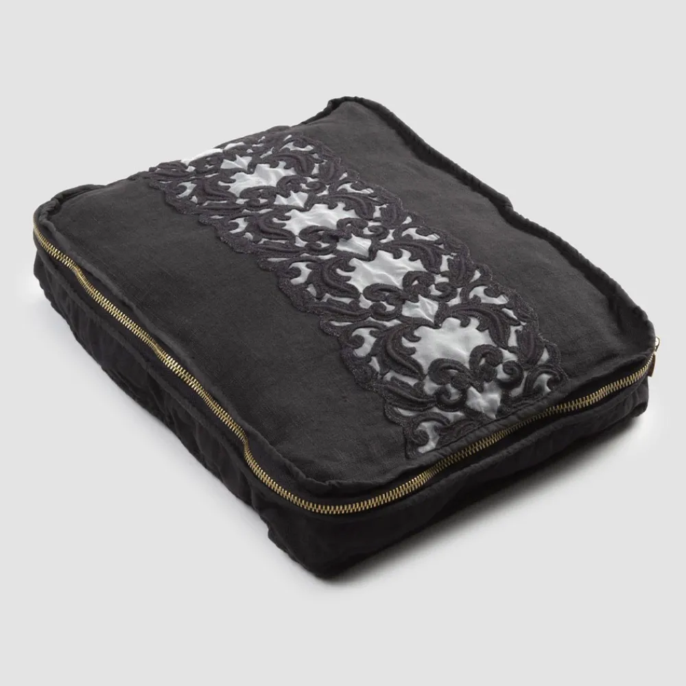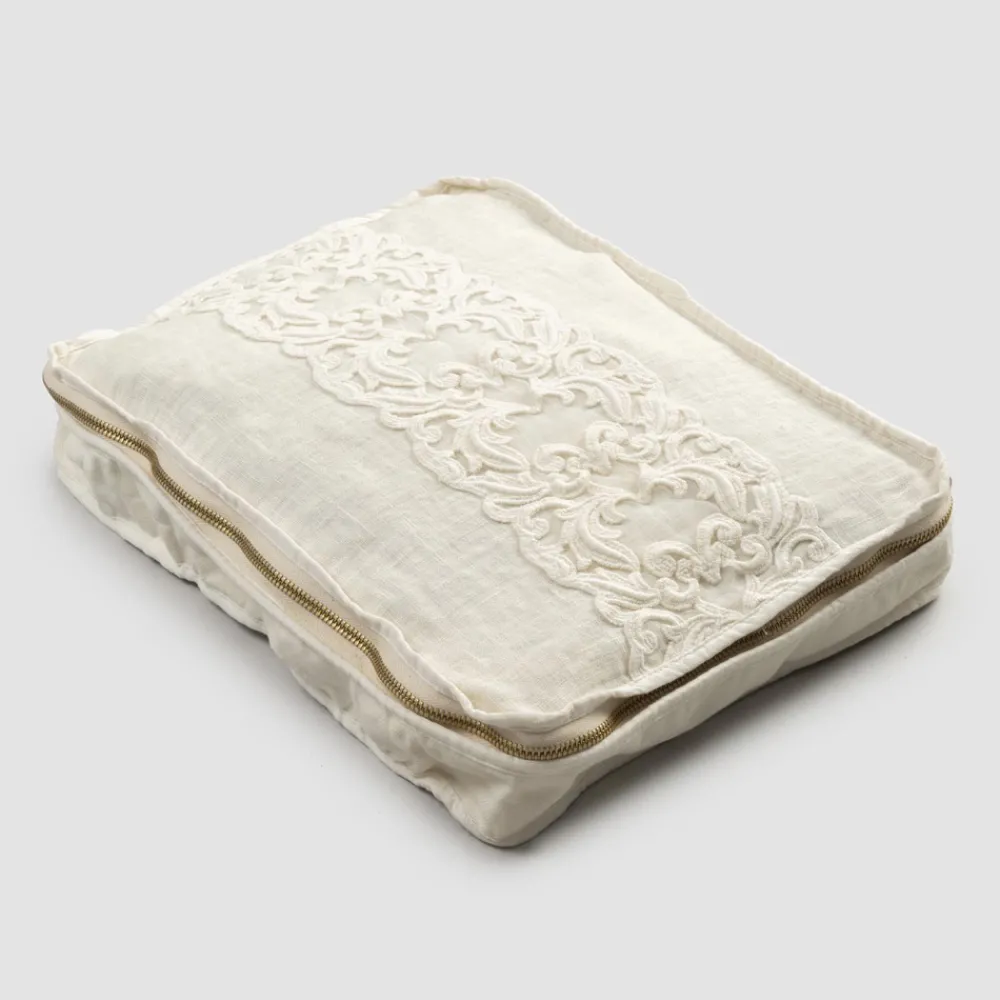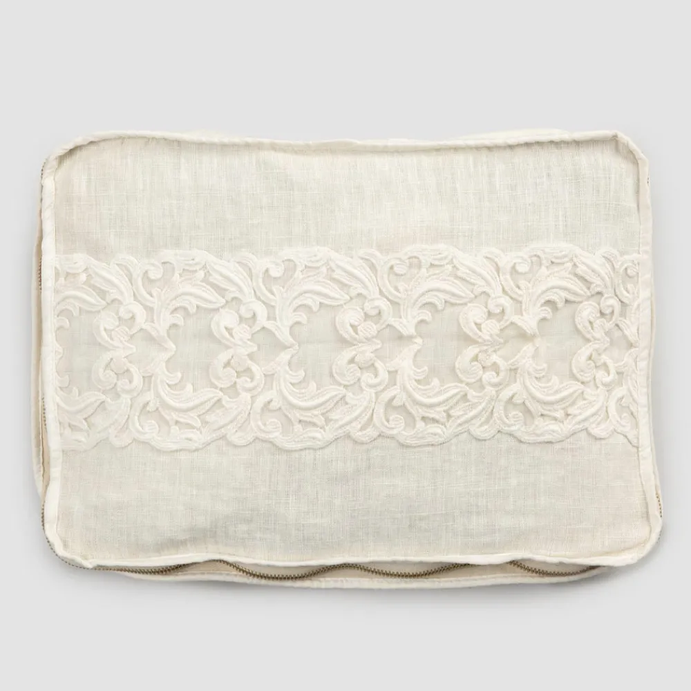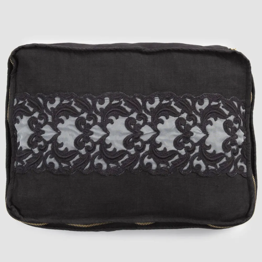 Der Wert der Tradition verbindet den modernen Lebensstil mit dieser großen rechteckigen Kosmetiktasche aus Leinen und Baumwolle mit Farnese-Spitze und Reißverschluss.