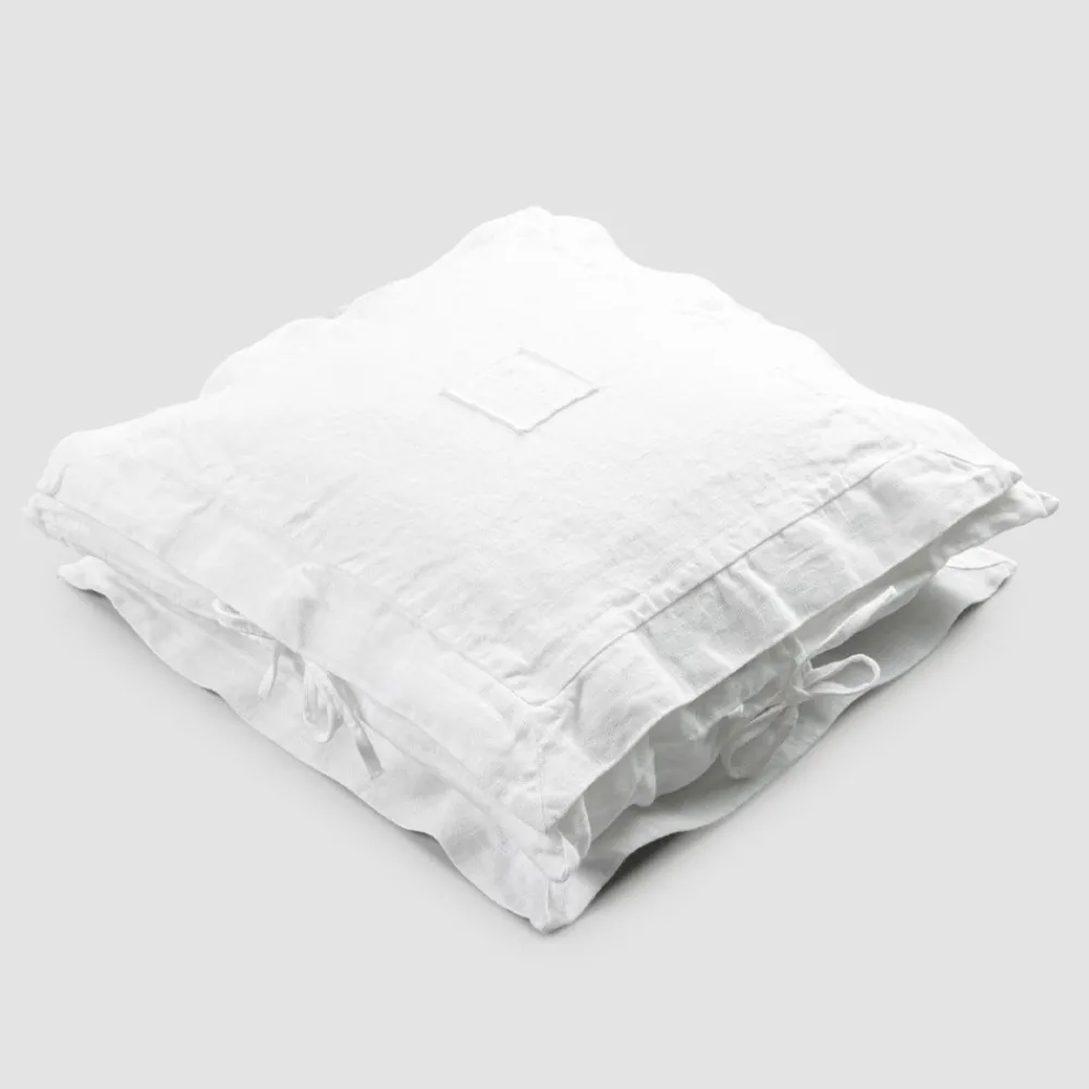 Der Wert der Tradition verbindet den modernen Lebensstil mit diesem schweren Kissenbezug aus weißem Leinen mit quadratischer Dekoration und Krawatten an den Seiten.