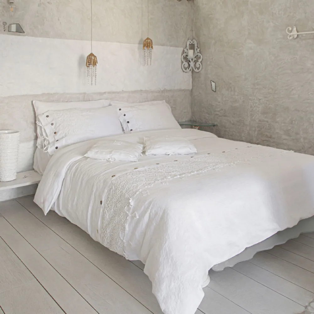 Durch die Liebe zum Detail und ein echtes Design , das auf die Essenz der Schönheit hinweist, entsteht ein authentisches und handwerkliches Produkt von höchster Qualität für die ausgewählten Rohstoffe wie reinstes Leinen und weichste Baumwolle. Die natürliche Unvollkommenheit des Materials kennzeichnet somit den Wert der Einfachheit , eingeschlossen in eine elegante und delikate Handwerkskunst für ein erhabenes und suggestives Sinneserlebnis