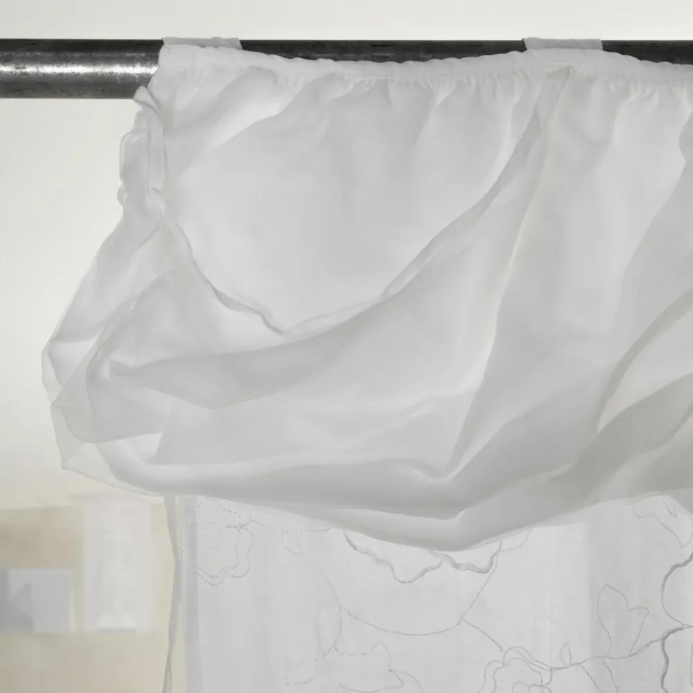Der Wert der Tradition wird mit dem modernen Lebensstil in diesem weißen Vorhang aus Leinengaze und Organza mit gestickten Rosen und zusammengerolltem Stoff in Verbindung mit Ringen für Stangen kombiniert.