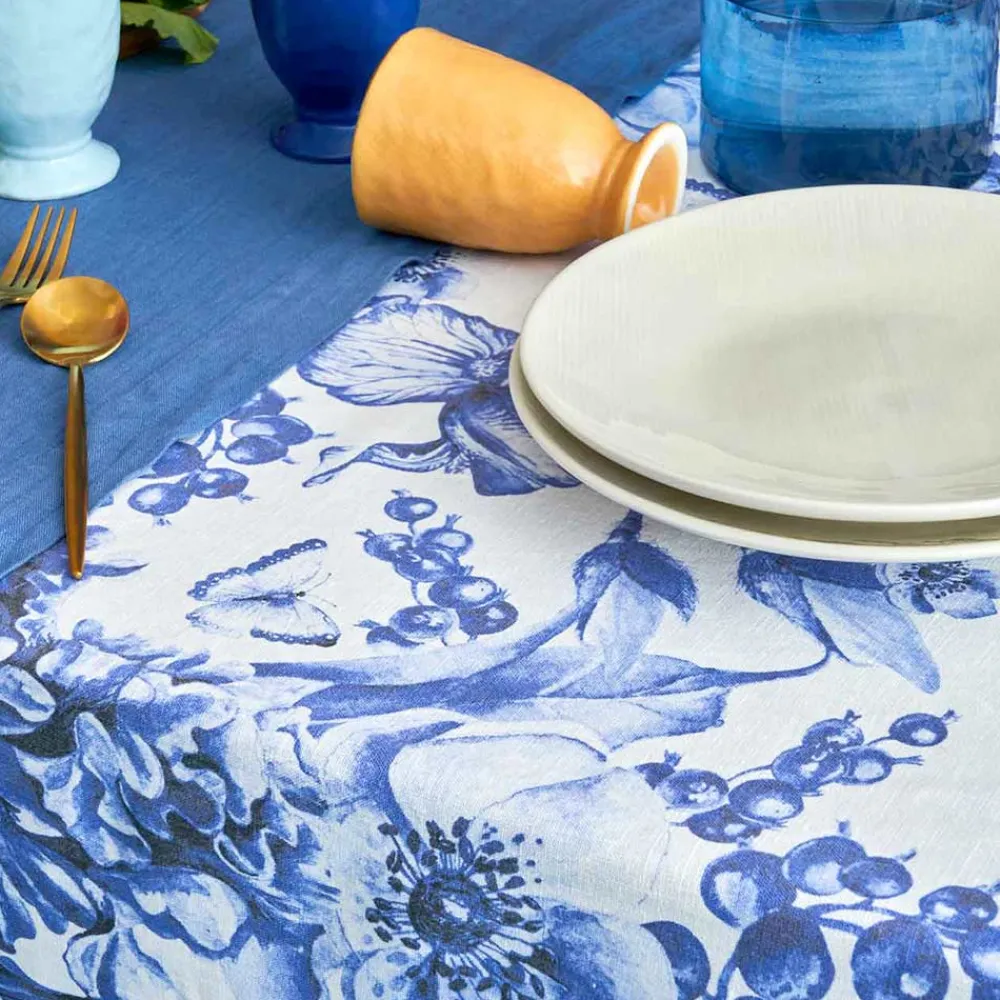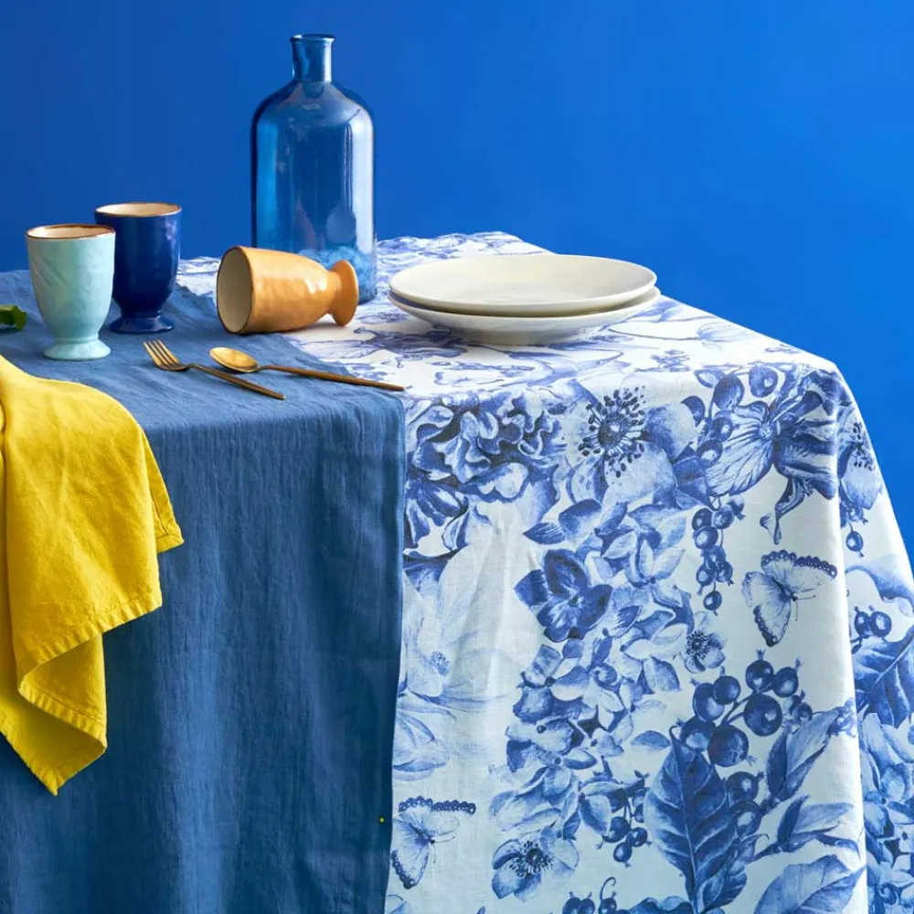 Tischdecke aus reinem Leinen, bedruckt und gewaschen, mit üppigem Blumenmuster.