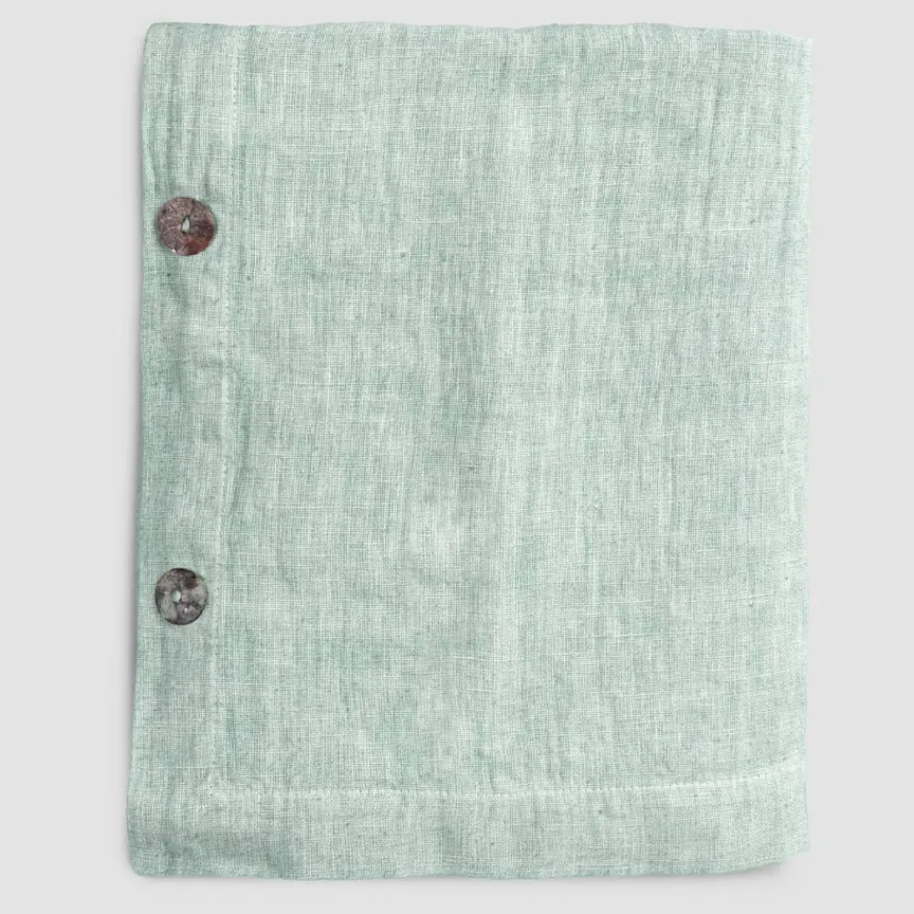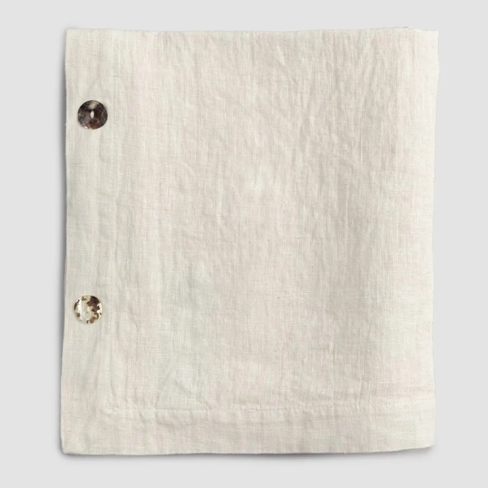 Der Wert der Tradition verbindet den modernen Lebensstil mit dieser schweren Leinentischdecke, die auf einer langen Seite mit einer Reihe von Agoya-Perlmuttknöpfen verziert ist.