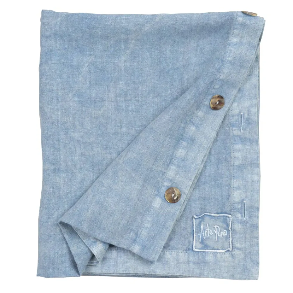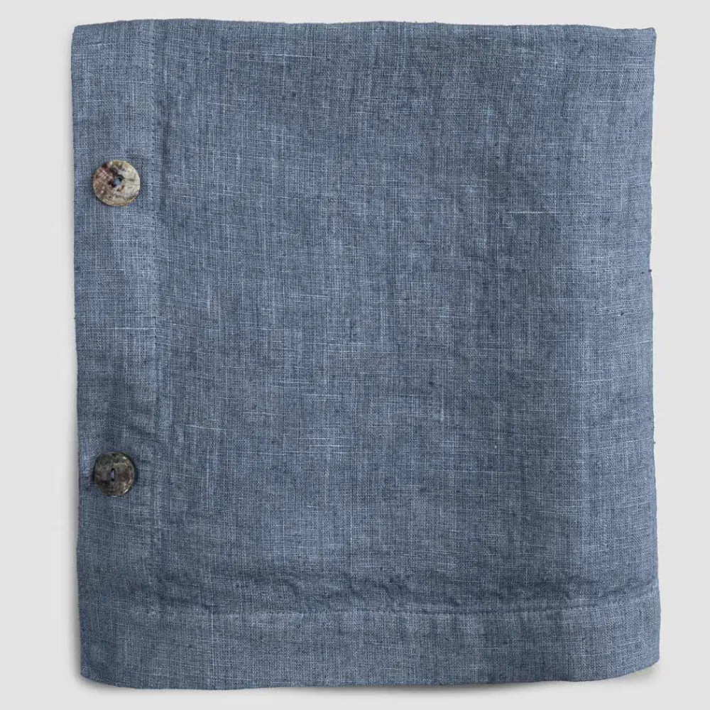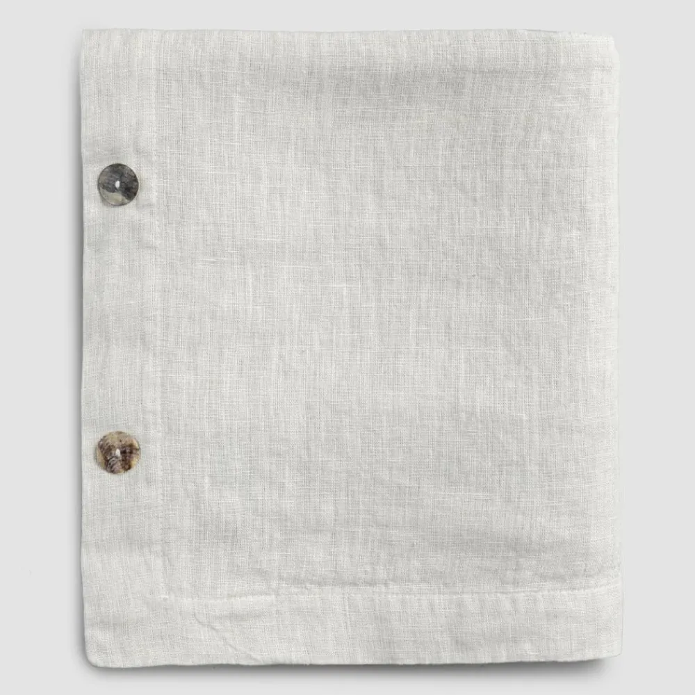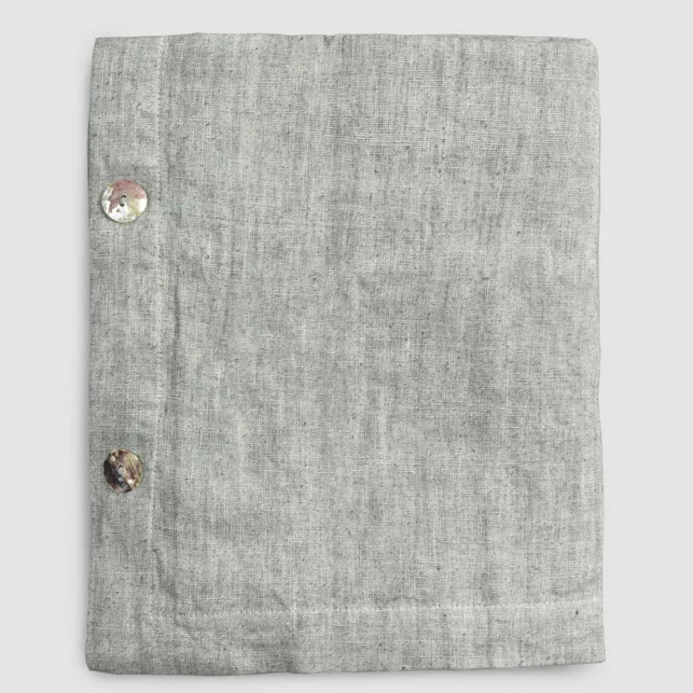 Der Wert der Tradition verbindet den modernen Lebensstil mit dieser schweren Leinentischdecke, die auf einer langen Seite mit einer Reihe von Agoya-Perlmuttknöpfen verziert ist.