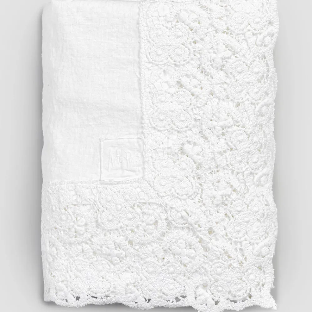 Tischdecke aus reinem weißem Leinen mit Spitze, hochwertiges Luxusdesign made in Italy.