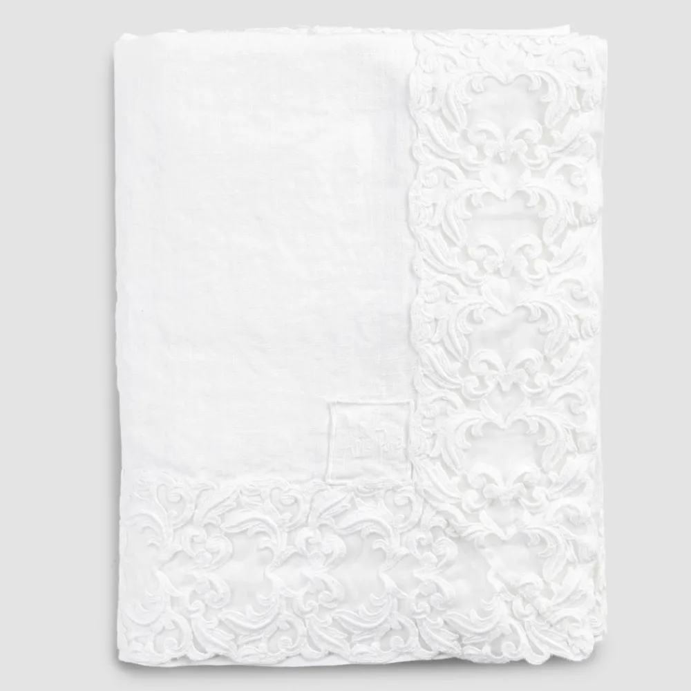 Der Wert der Tradition verbindet den modernen Lebensstil mit dieser schweren Leinentischdecke, die in zwei Ausführungen erhältlich ist und mit Farnese-Spitze verziert ist, die auf den Rahmen aller Seiten und die gefaltete Kante genäht ist.