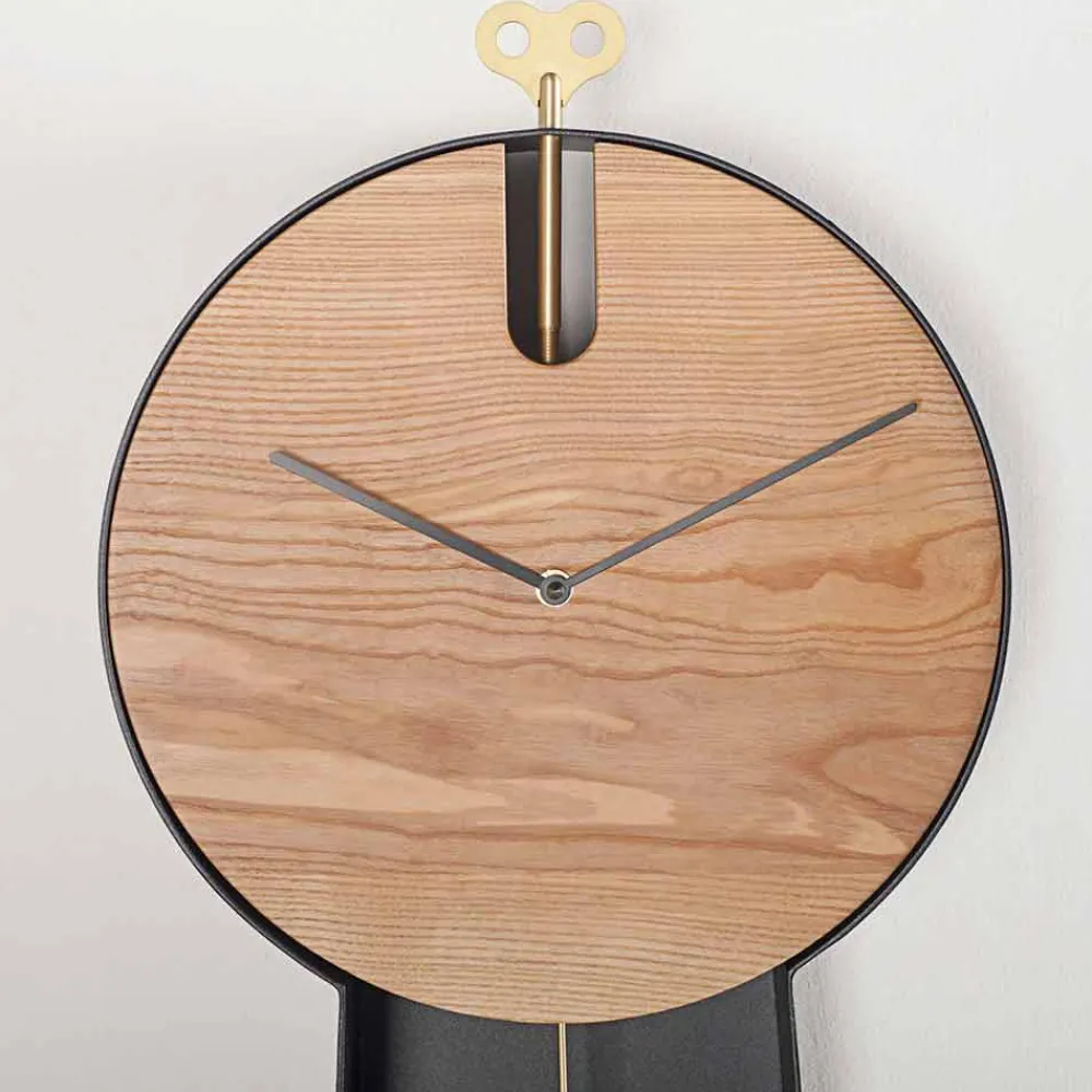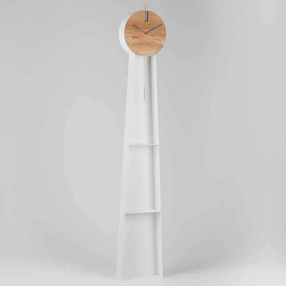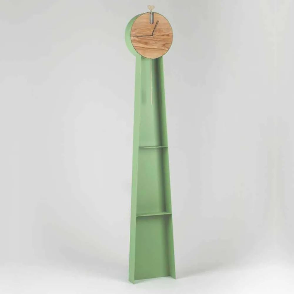 Diese Bodenpendeluhr ist ein innovatives Objekt, das ein innovatives und äußerst modernes Design mit einer klassischeren Note kombiniert, die der für alte Pendeluhren typische Aufzugsschlüssel aus Messing verleiht. Die Struktur ist vollständig in Italien aus RAL-lackiertem Stahl handgefertigt und verfügt über zwei praktische Regale, in denen Möbelstücke platziert werden können, die dem Produkt noch mehr Persönlichkeit und Charakter verleihen. Die Uhr besteht stattdessen aus massivem Eschenholz, das zusammen mit Stahl eine raffinierte und moderne Ästhetik ergibt.