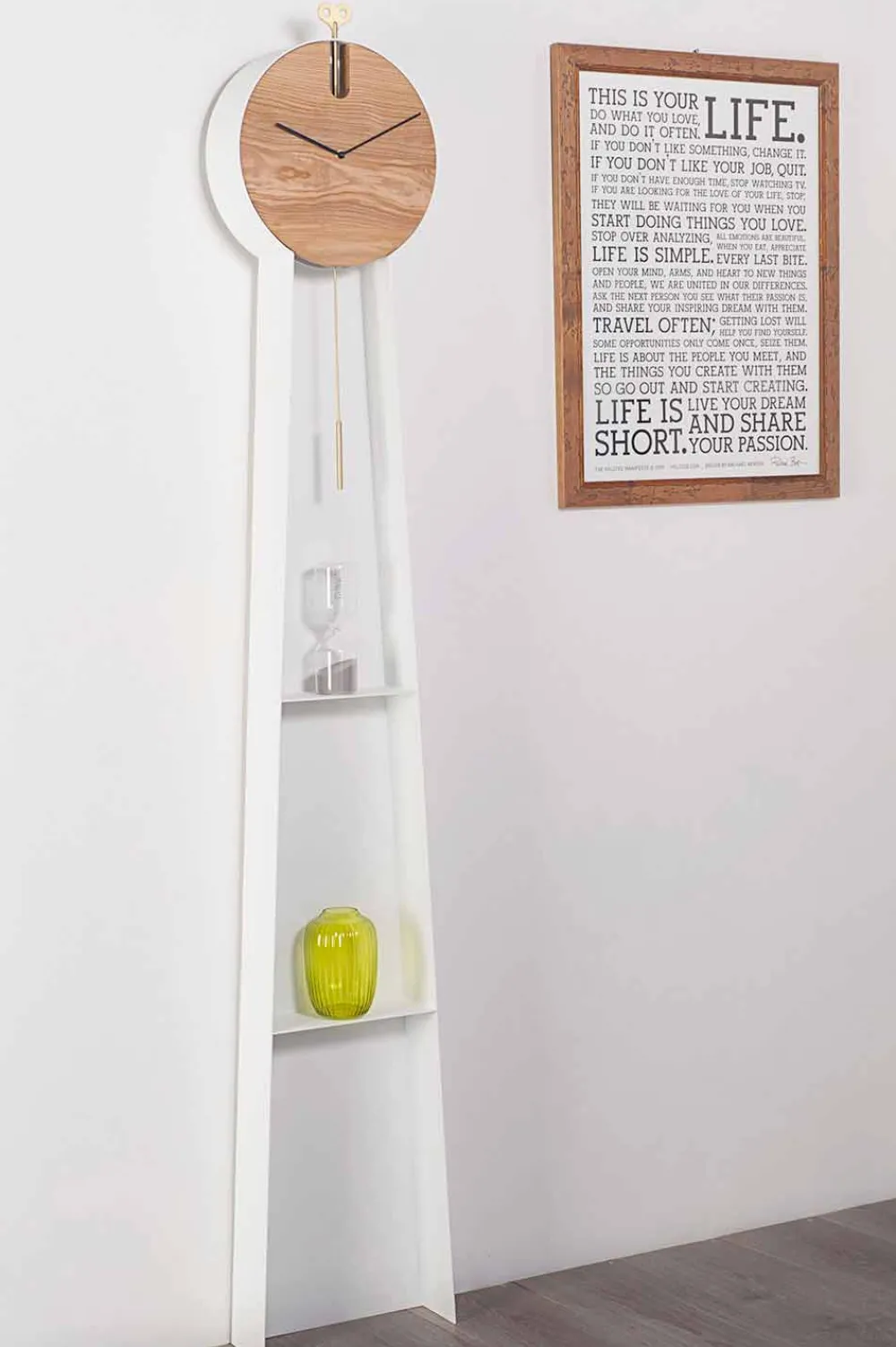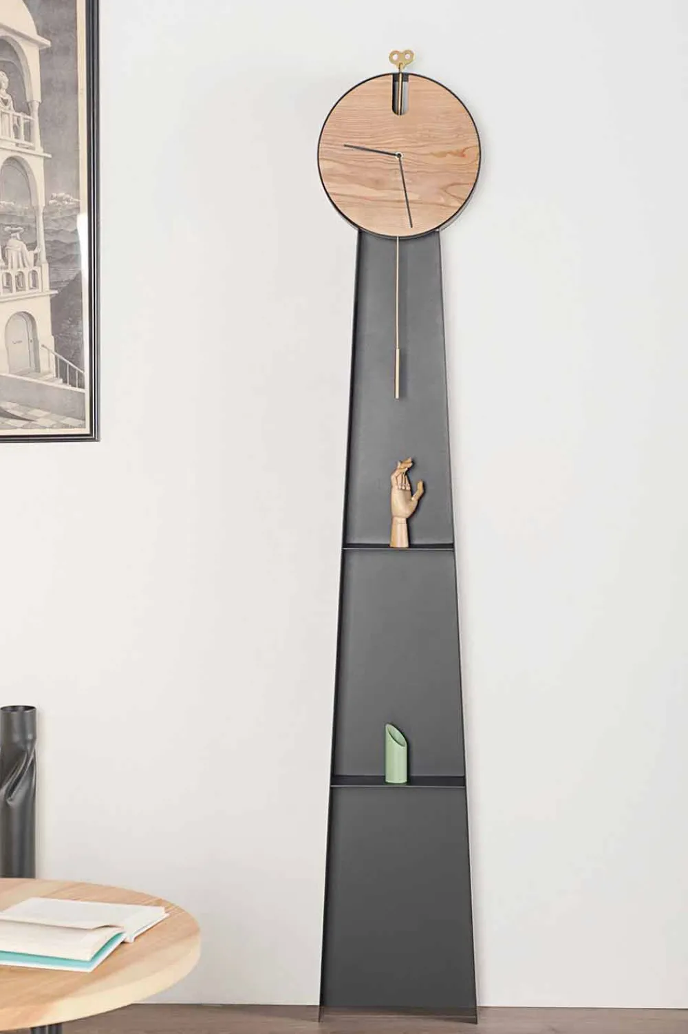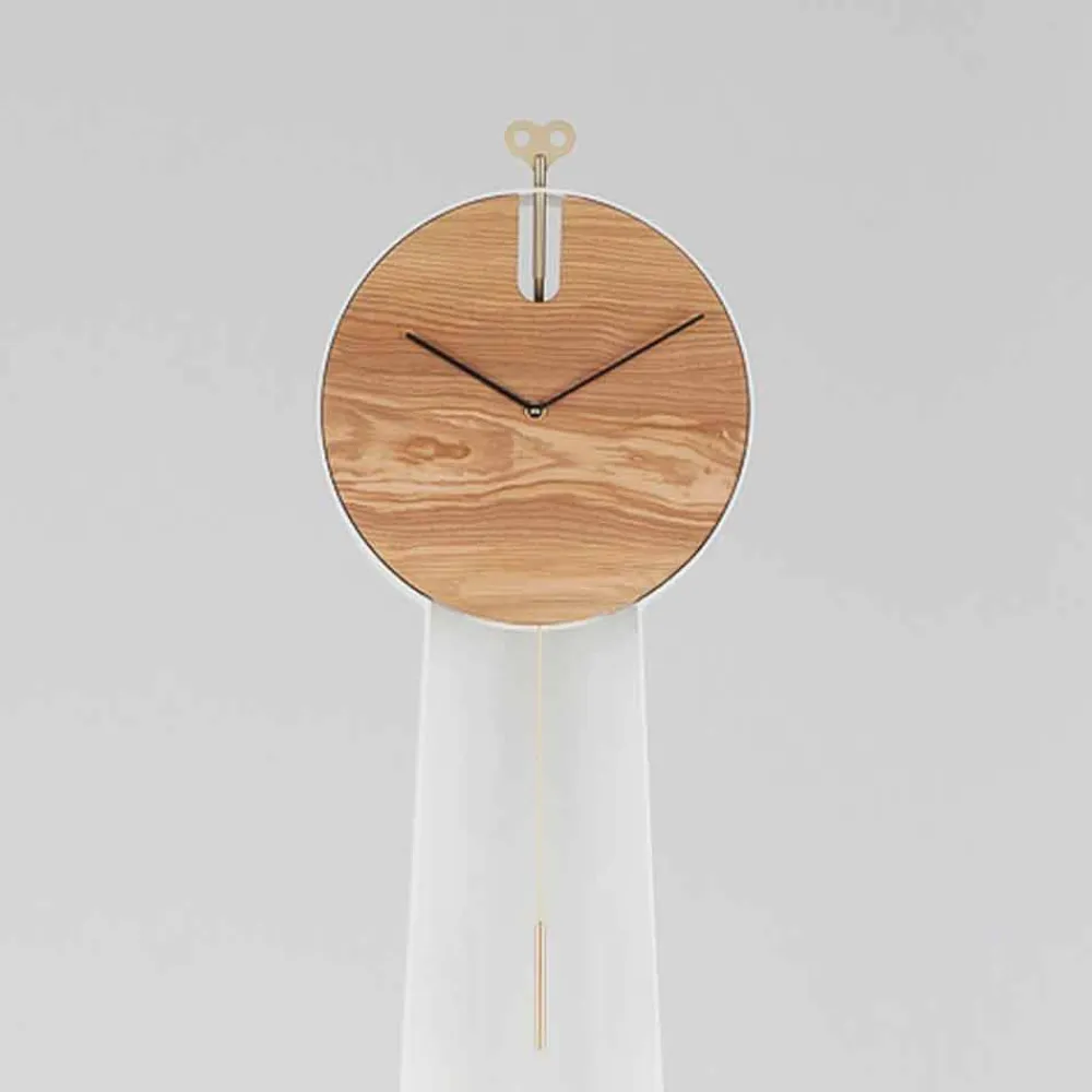 Diese Bodenpendeluhr ist ein innovatives Objekt, das ein innovatives und äußerst modernes Design mit einer klassischeren Note kombiniert, die der für alte Pendeluhren typische Aufzugsschlüssel aus Messing verleiht. Die Struktur ist vollständig in Italien aus RAL-lackiertem Stahl handgefertigt und verfügt über zwei praktische Regale, in denen Möbelstücke platziert werden können, die dem Produkt noch mehr Persönlichkeit und Charakter verleihen. Die Uhr besteht stattdessen aus massivem Eschenholz, das zusammen mit Stahl eine raffinierte und moderne Ästhetik ergibt.