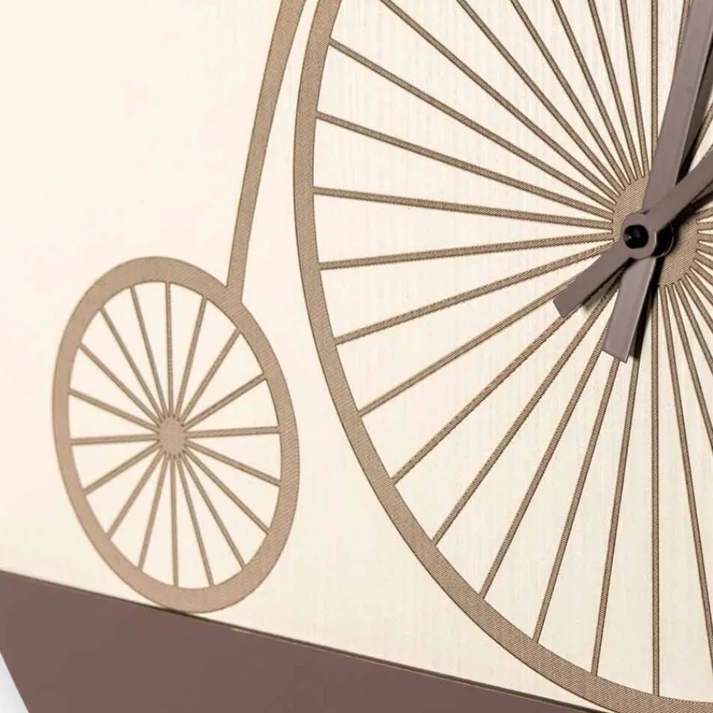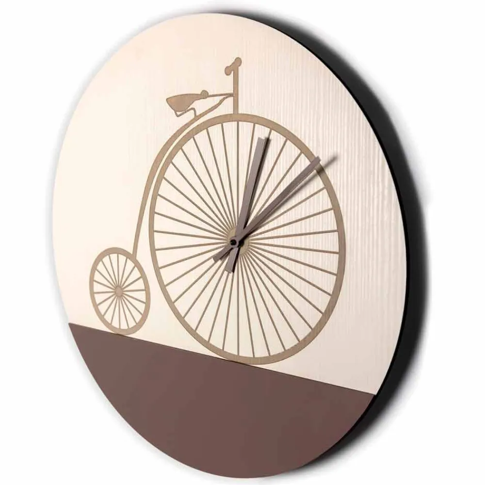 Wanduhr aus Tafel oder Eschenholz mit lasergezeichnetem Dekorationsfahrrad, hergestellt in Italien.