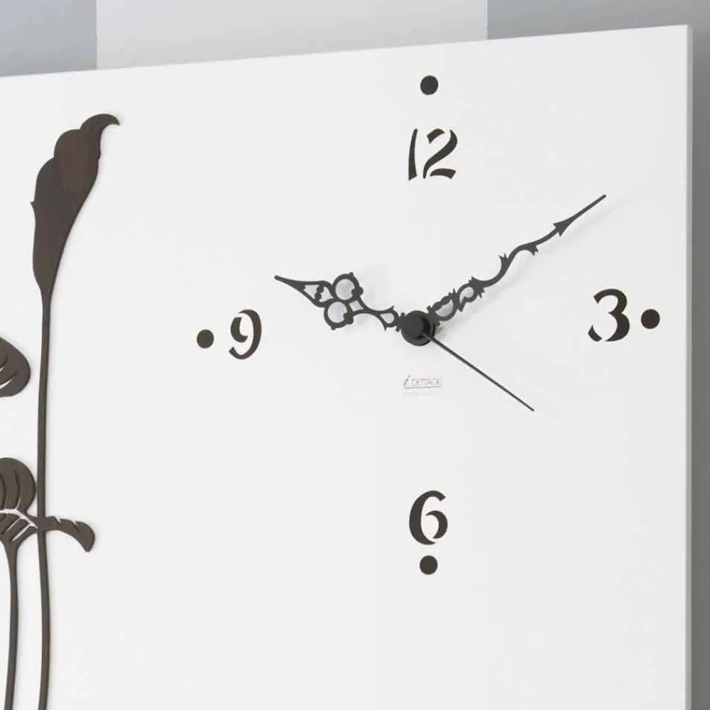 Weiße Wanduhr mit Dekorationen, modernes Holzdesign hergestellt in Italien.
