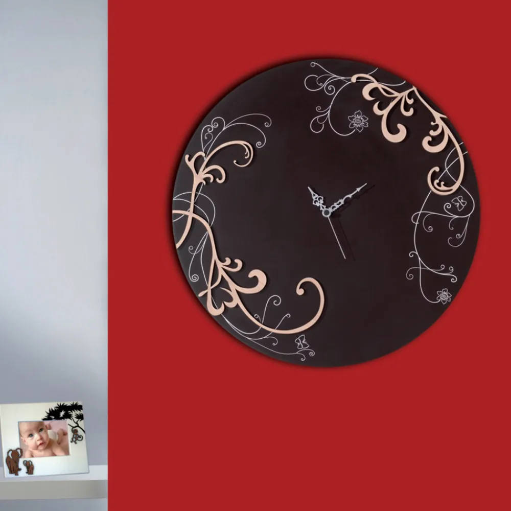 Das Rundholz Uhr präsentiert eine anspruchsvolle und noble Art, dank sein Design mit geschwungenen Holzdekorationen, nützlich für die Räume des Hauses mit Eleganz und Anmut zu dekorieren.