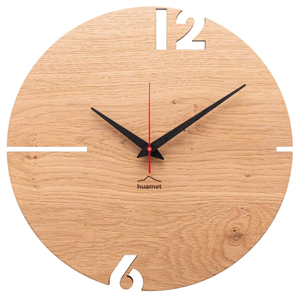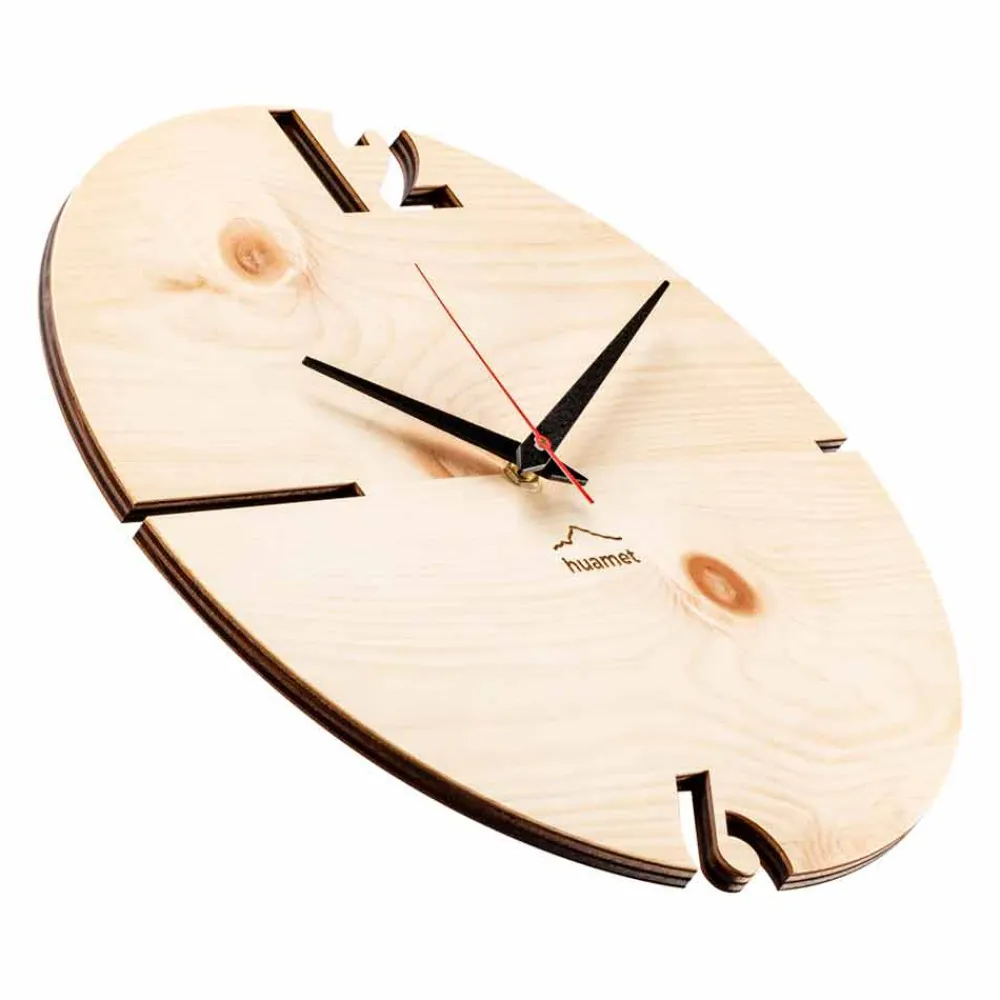 Hergestellt ausschließlich von Hand in Italien aus Holz mit den Minutenzeigern aus schwarzem Birkenholz und den zweiten aus rot oxidiertem Aluminium ; Sie bewegen sich durch langsames Ziehen und schweigen daher.