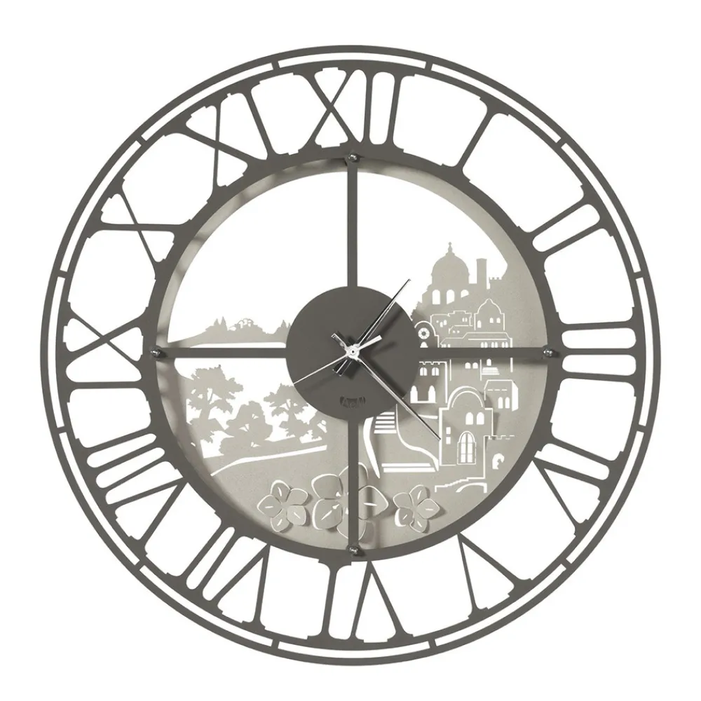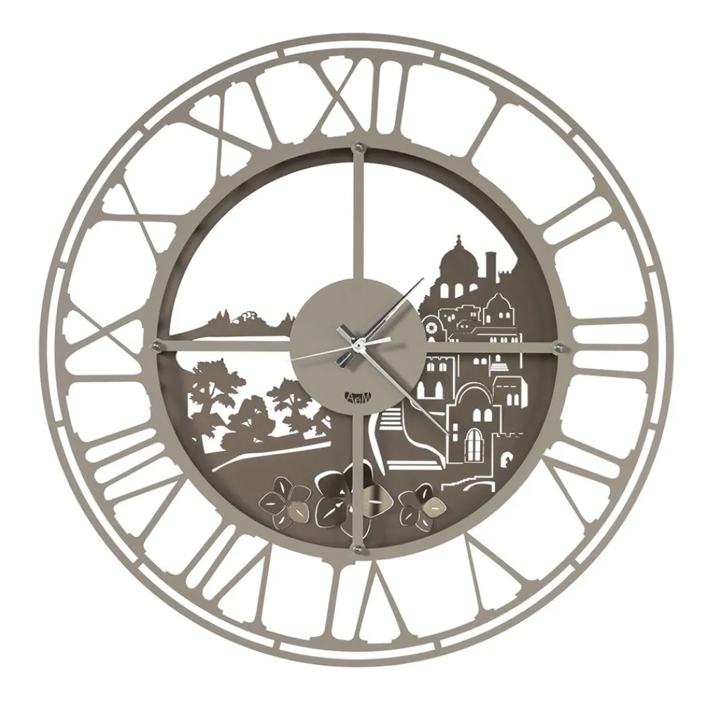 Diese Wanduhr mit minimalistischem Design feiert Italien und die Schönheit seiner Landschaften und fügt verschiedene Panoramen in das Zifferblatt ein, von den Profilen der üppigen Landschaft bis zu denen der ikonischen Städte.