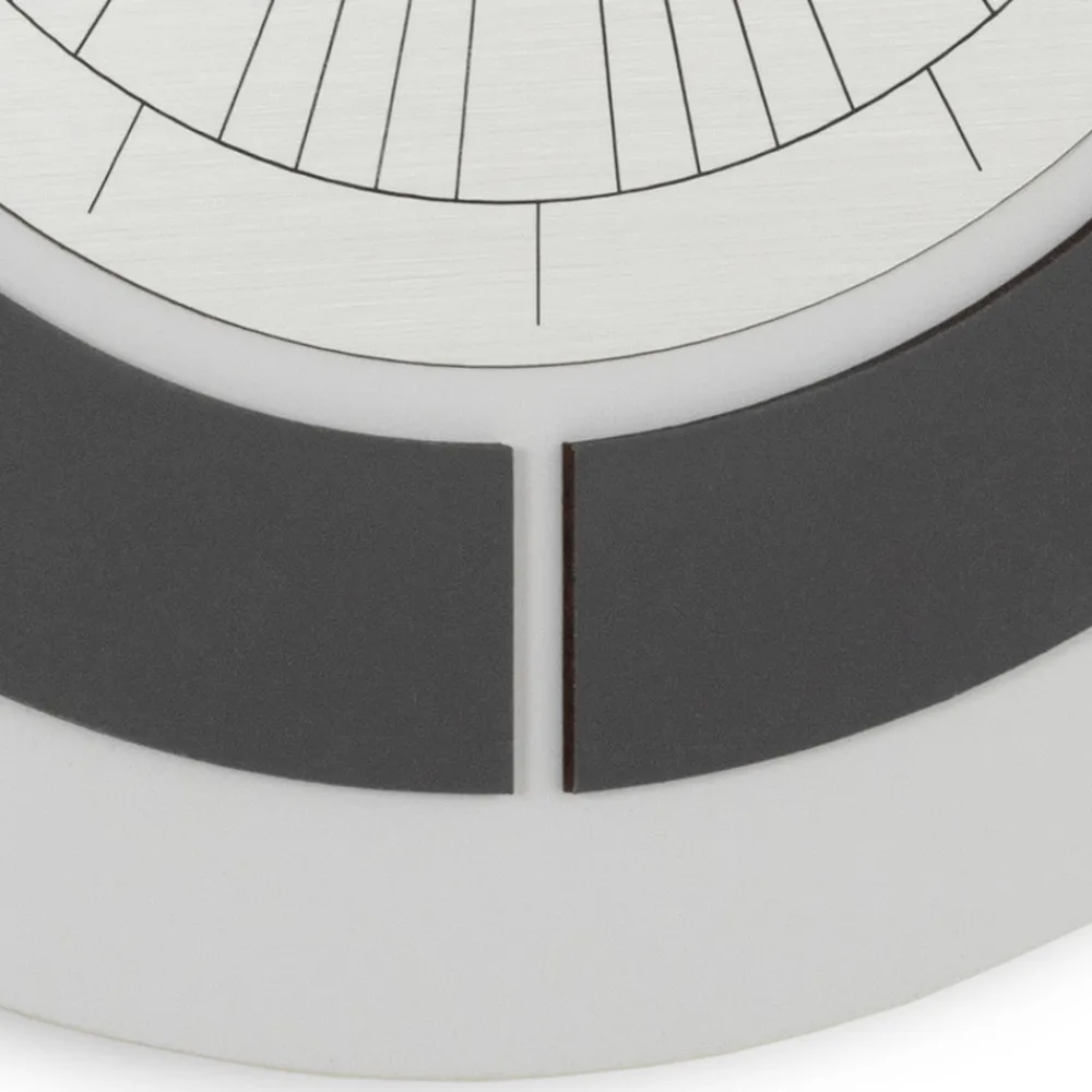 Wanduhr aus hochdichtem, halb expandiertem PVC. Der geprägte Rahmen ist mit einer Polypropylenfolie verbunden, die sich farblich von der Basis abhebt. Das Schneiden und Gravieren des Ziffernblatts erfolgt mit computergesteuerten High-Tech-Werkzeugen.