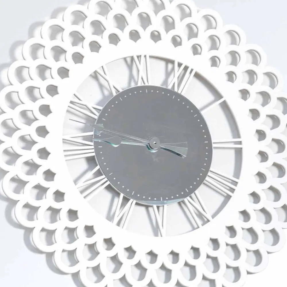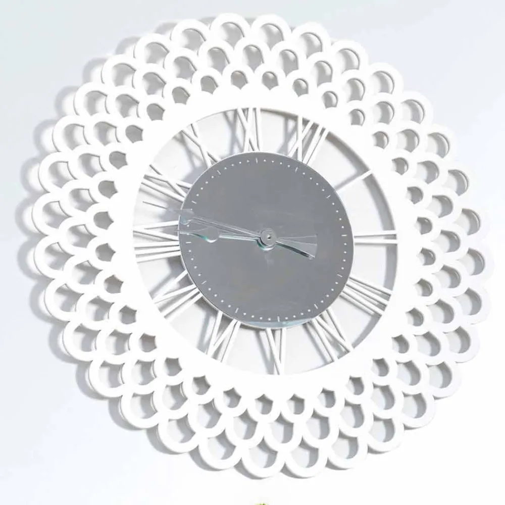Große Wanduhr, modernes weißes Holzdesign mit Spiegeldekoration, Blumenform made in Italy.