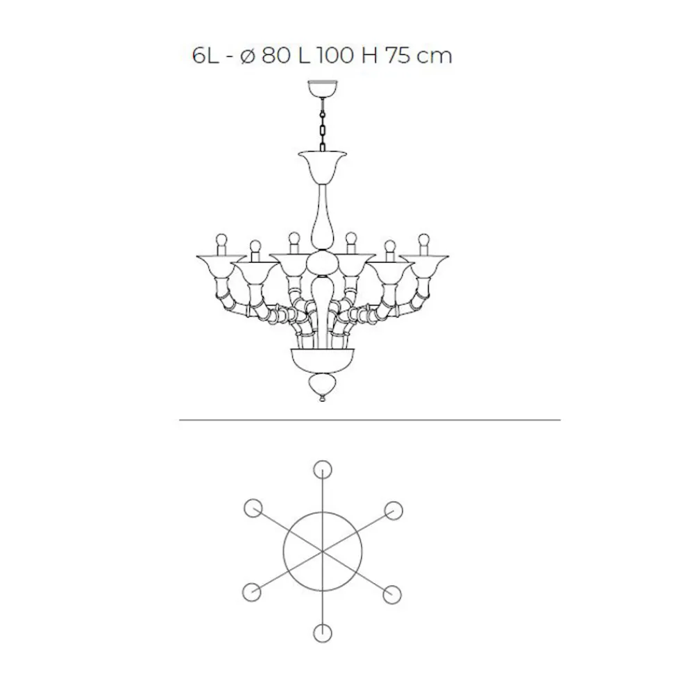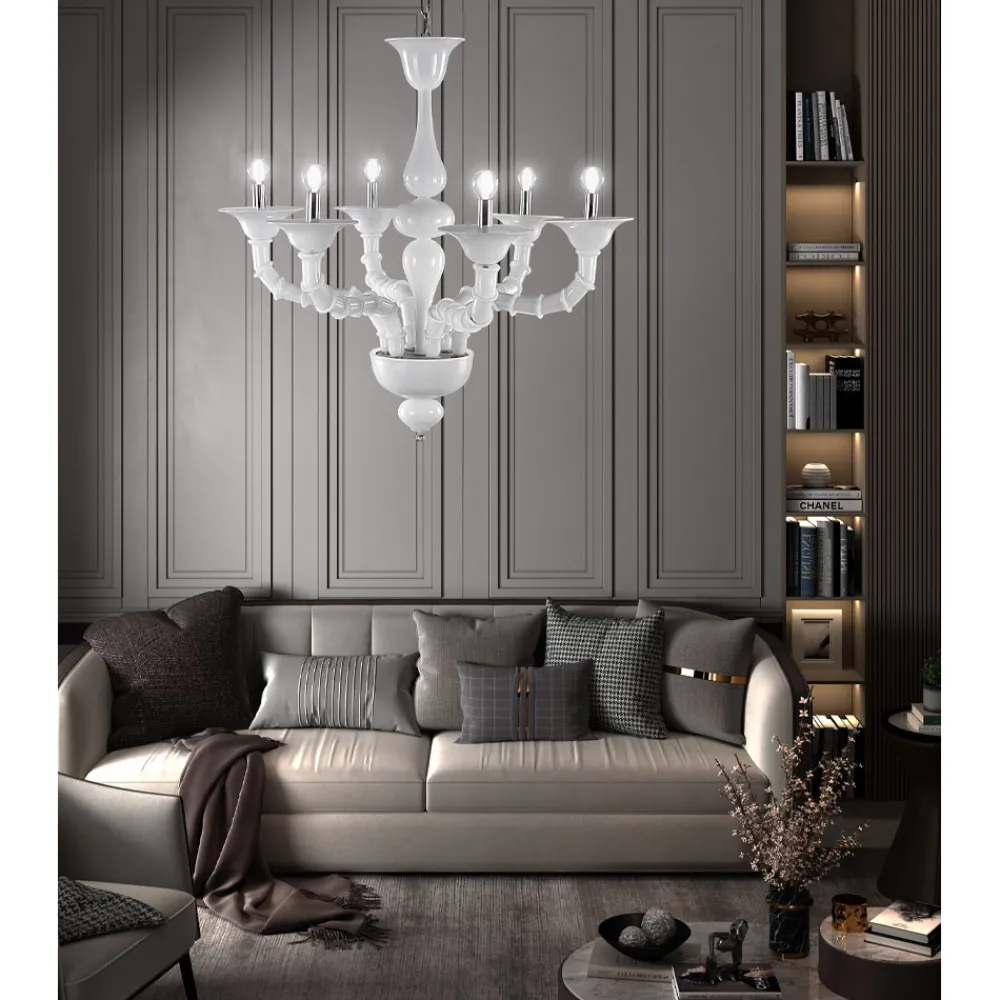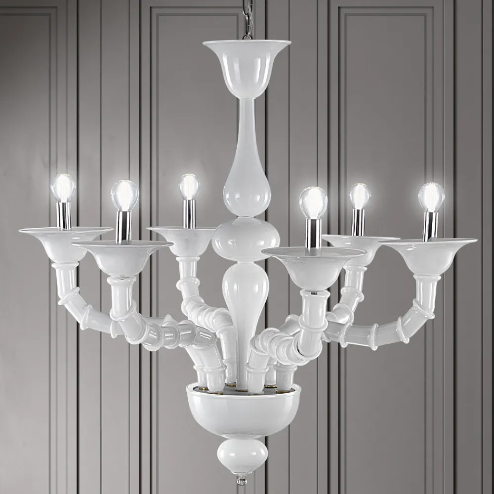 Ein Kunstwerk, das sich durch einen Triumph kostbarer Details aus mundgeblasenem weißem Rezzonico-Glas auszeichnet, das große Bereiche des Hauses wie Esszimmer oder Wohnzimmer vervollständigt und eine hochwertige Beleuchtung mit einer faszinierenden Persönlichkeit zum Leben erweckt. Die Länge der Arme wird durch die spezielle Technik, die als „Bossole“ bezeichnet wird, ermöglicht, die darin besteht, mehrere Glasteile zusammenzusetzen, die ein Zeugnis von großer Handwerkskunst sind .