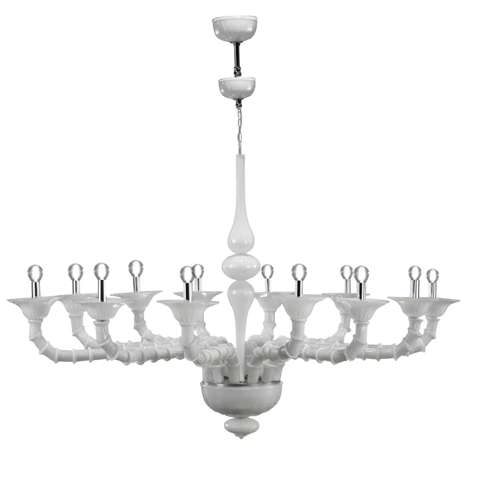 Mundgeblasener Kronleuchter aus weißem venezianischen Glas mit 12 Lichtern, klassischer Stil.