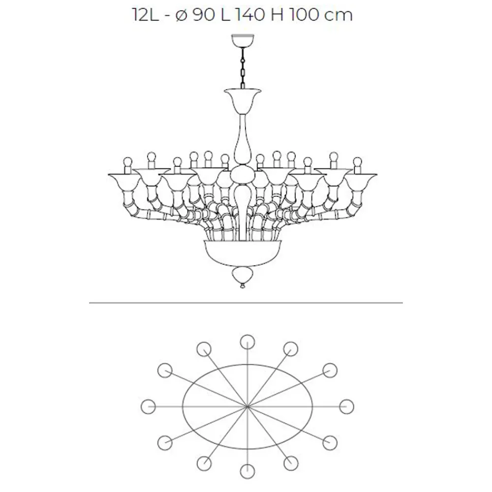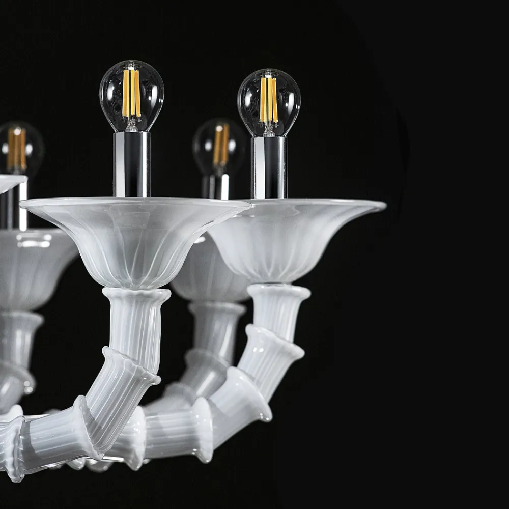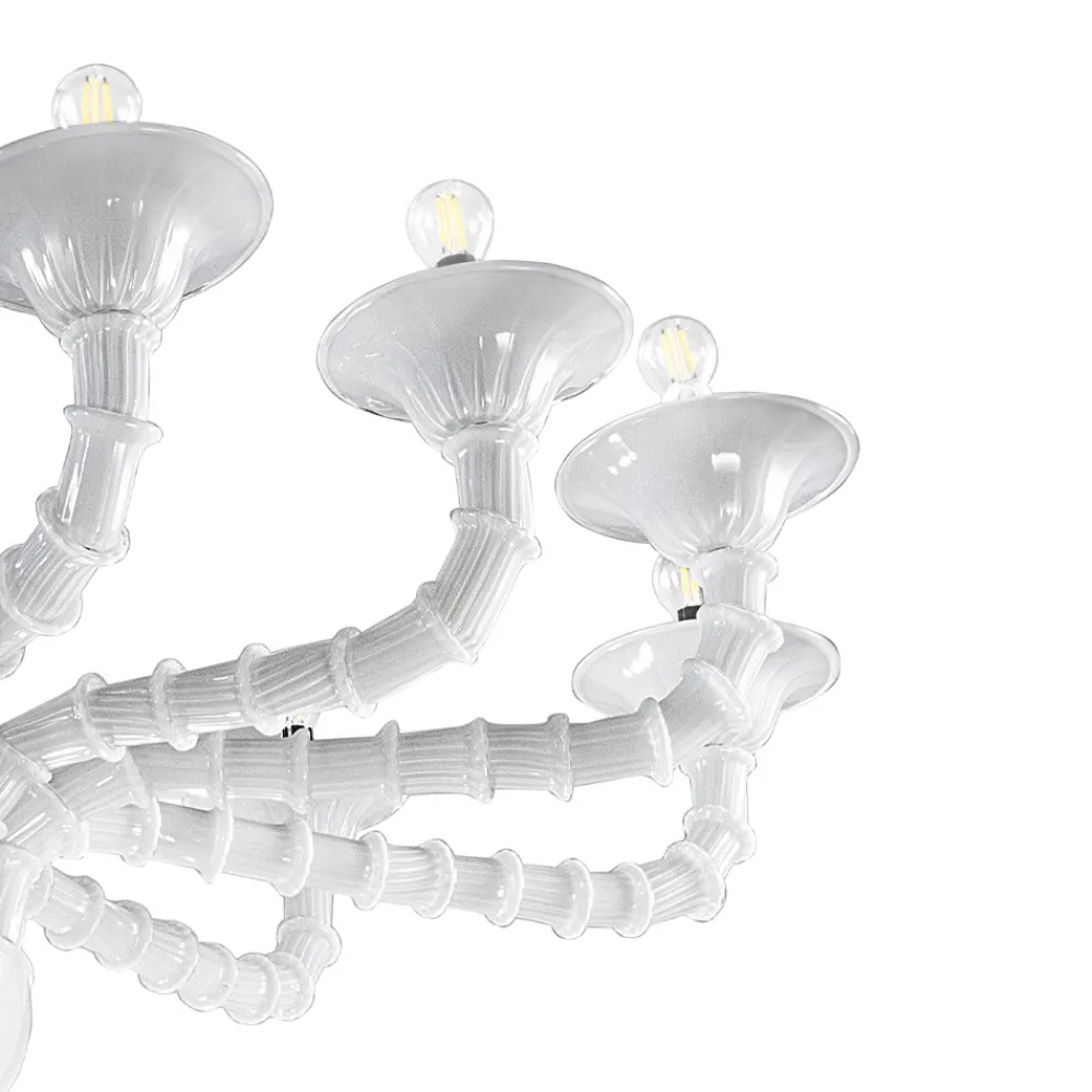 Ein Kunstwerk, das sich durch einen Triumph kostbarer Details aus mundgeblasenem weißem Rezzonico-Glas auszeichnet, das große Bereiche des Hauses wie Esszimmer oder Wohnzimmer vervollständigt und eine hochwertige Beleuchtung mit einer faszinierenden Persönlichkeit zum Leben erweckt. Die Länge der Arme wird durch die spezielle Technik, die als „Bossole“ bezeichnet wird, ermöglicht, die darin besteht, mehrere Glasteile zusammenzusetzen, die ein Zeugnis von großer Handwerkskunst sind .