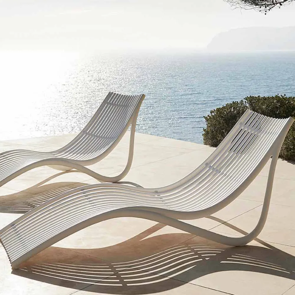Diese Sonnenliege für den Garten zeichnet sich durch ihre monoblockförmigen Wellenformen aus, die an das Meer erinnern und ergonomischen Komfort für eine avantgardistische und stilvolle Erholung bieten.