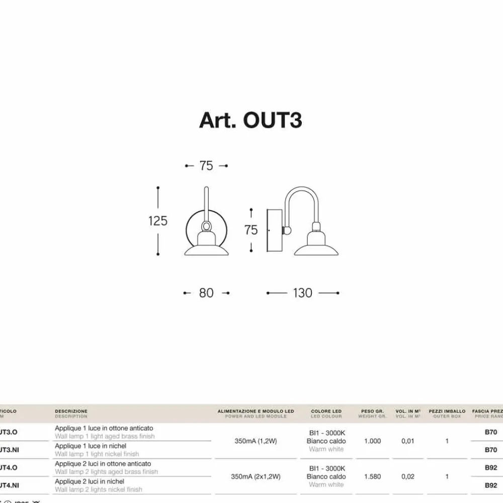 Designer Wandleuchte Bugatti von Aldo Bernardi , erhältlich mit Nischen- oder Antikmessing-Finish.