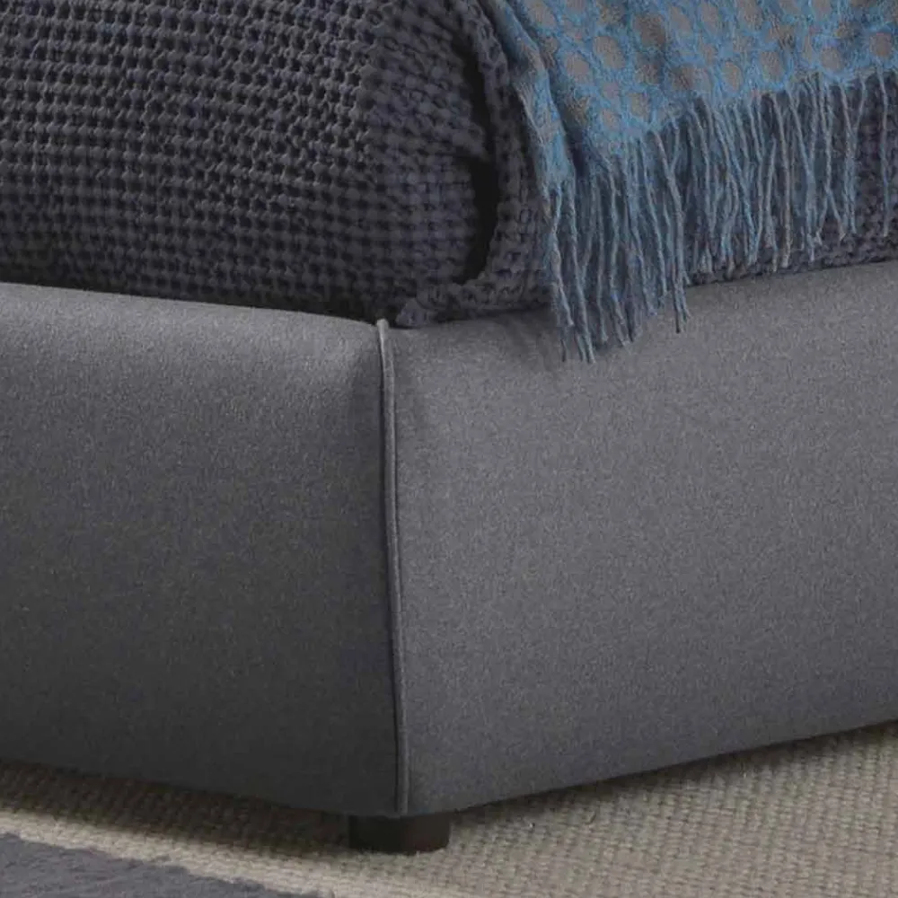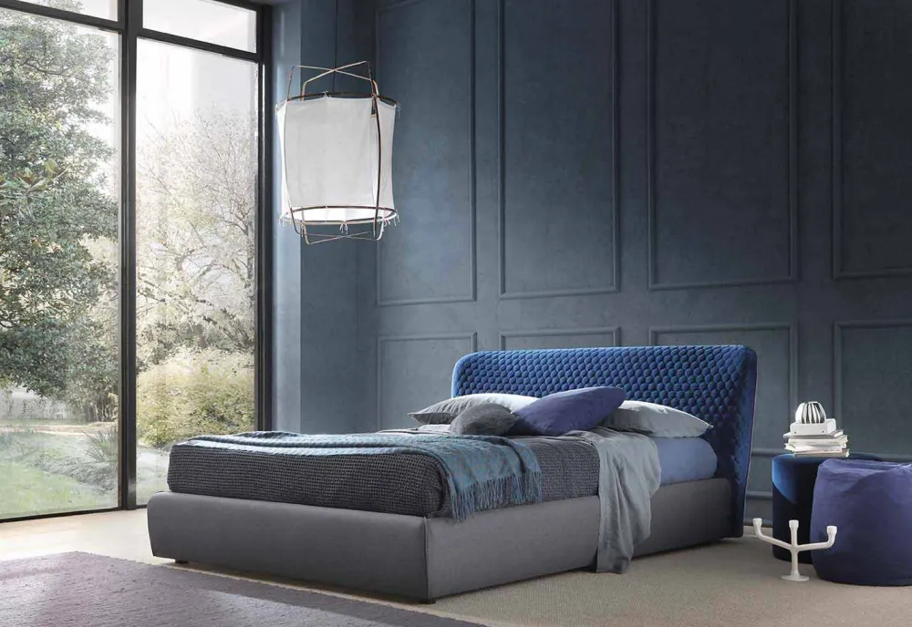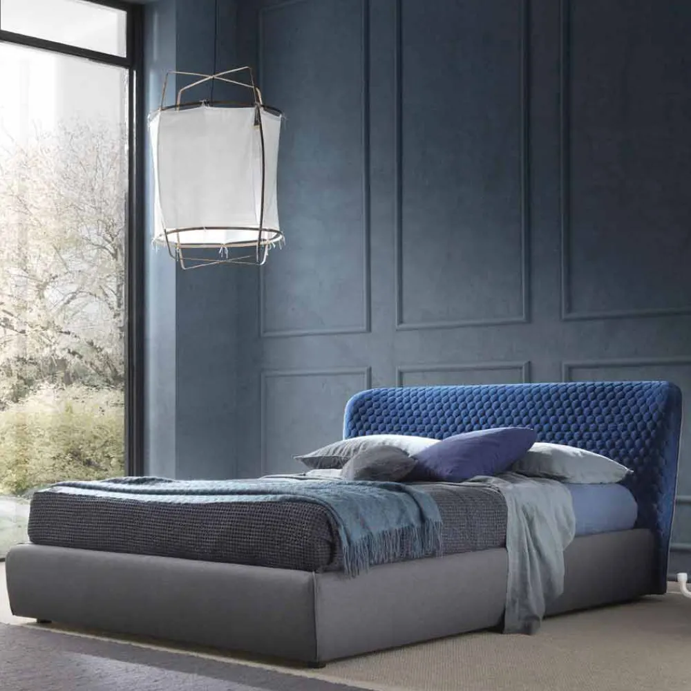 Das Doppelbett Corolle mit zeitgenössischem Design hat eine geschwungene Linie, die mit einer sorgfältigen Farbauswahl verflochten ist. Weiche Linien, die wir auch in der Textur des Kopfteils finden. Der Behälter hat eine Struktur aus Holzagglomerat mit einer synthetischen Innenbeschichtung in Tannenoptik, die durch Profile aus expandiertem Polyurethan und Rohren gestützt wird.