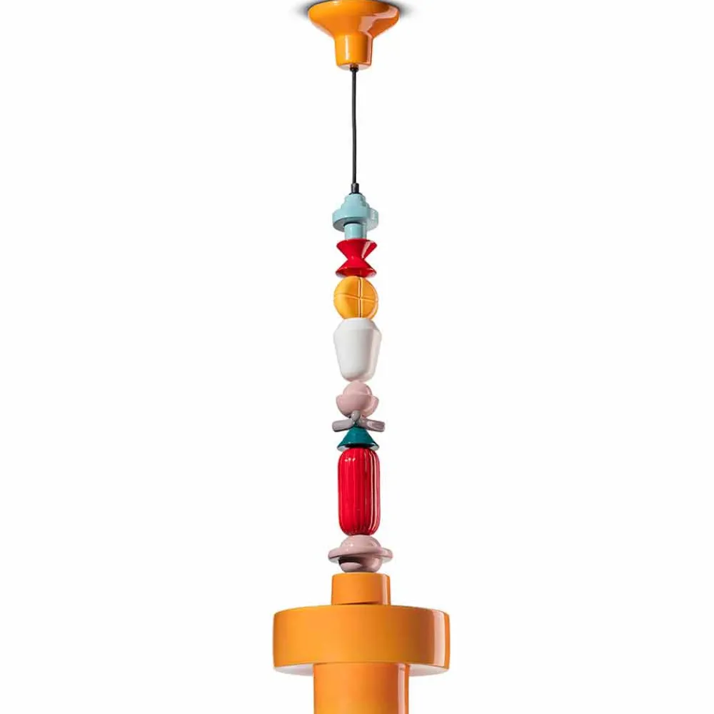 Lariat ist mit mehrfarbigen Keramikelementen verziert, die vertikal bis zum zentralen geometrischen Diffusor aufeinander folgen.