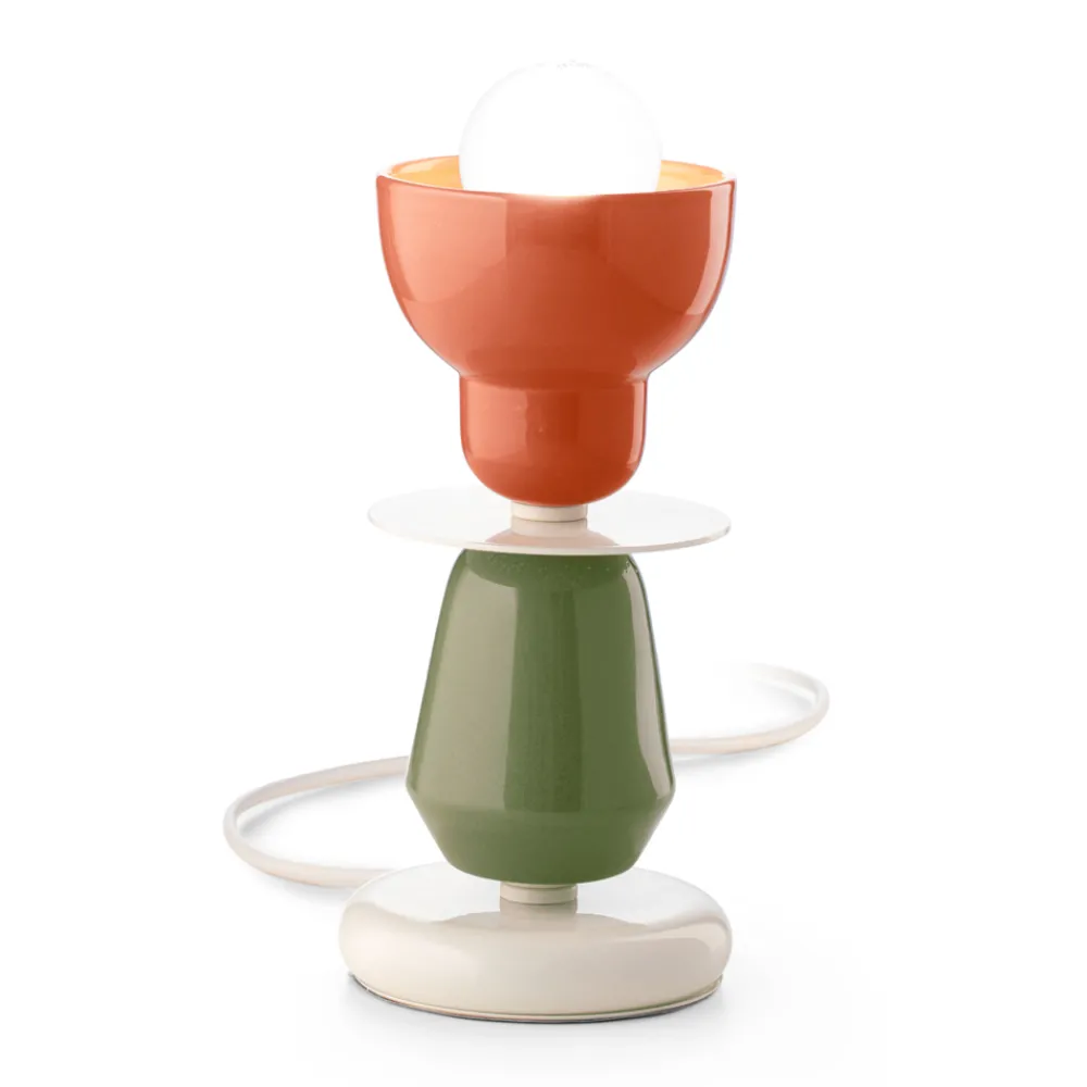 Tischlampe aus farbiger Keramik , weiß lackierter Eisensockel und Kabel mit weißer PCV-Verkabelung, komplett in Italien hergestellt.