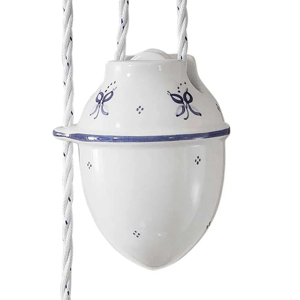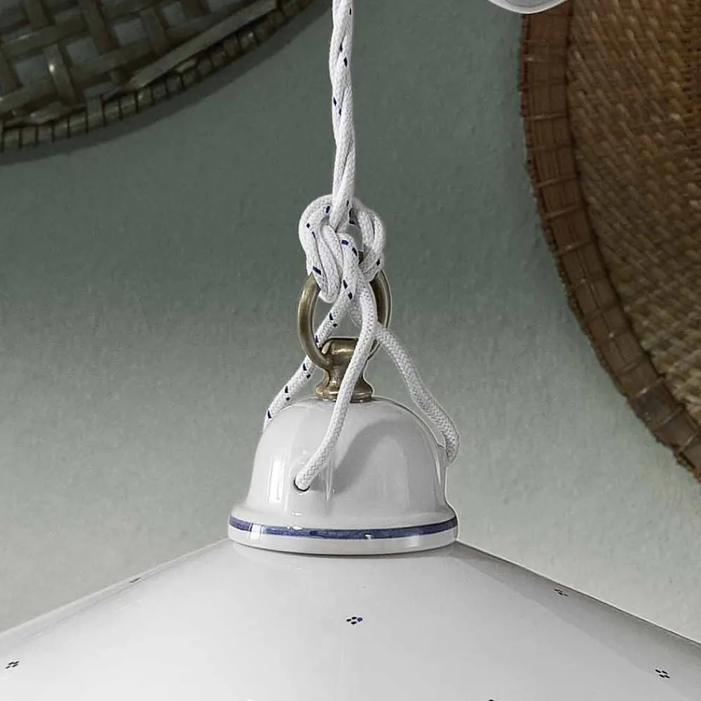Die Pendelleuchte mit Gleitschiene besteht vollständig aus Eisen und Keramik mit handbemalten blauen Fadenverzierungen die das Geschick und die handwerklichen Fähigkeiten der Handwerker hervorheben.