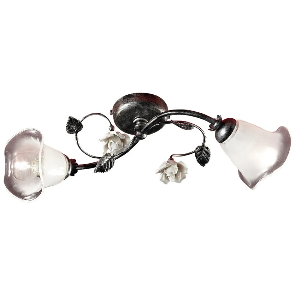 Diese 2-Licht-Deckenleuchte besteht vollständig aus einer Metallstruktur , die an belaubte Zweige erinnert, und schattierten sandgestrahlten Glaslampenschirmen mit handgefertigten Dekorationen in Form von Keramikrosen . um das Geschick und die handwerklichen Fähigkeiten der Handwerker hervorzuheben.