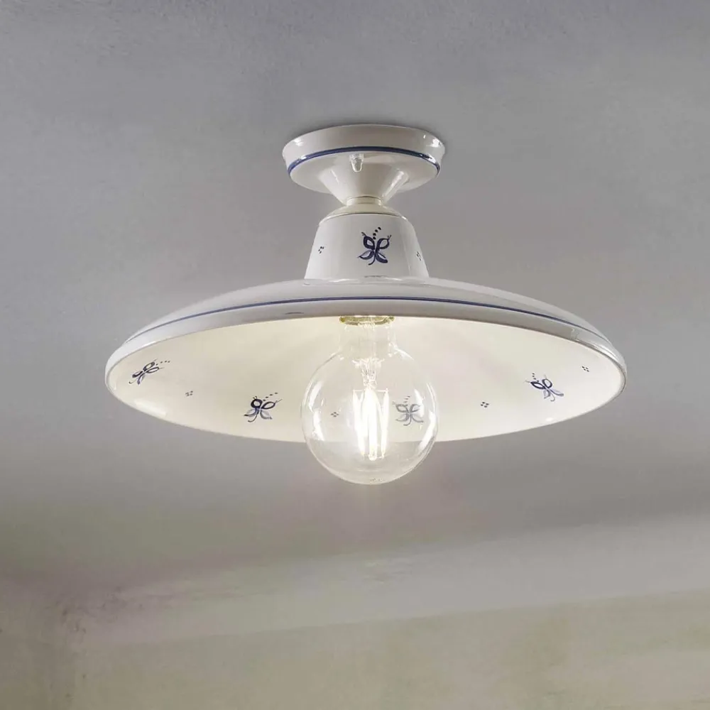 Die Deckenleuchte besteht vollständig aus Eisen und weißer Keramik mit zarten handgemalten Verzierungen , die die Handwerkskunst und Geschicklichkeit der Handwerker unterstreichen.