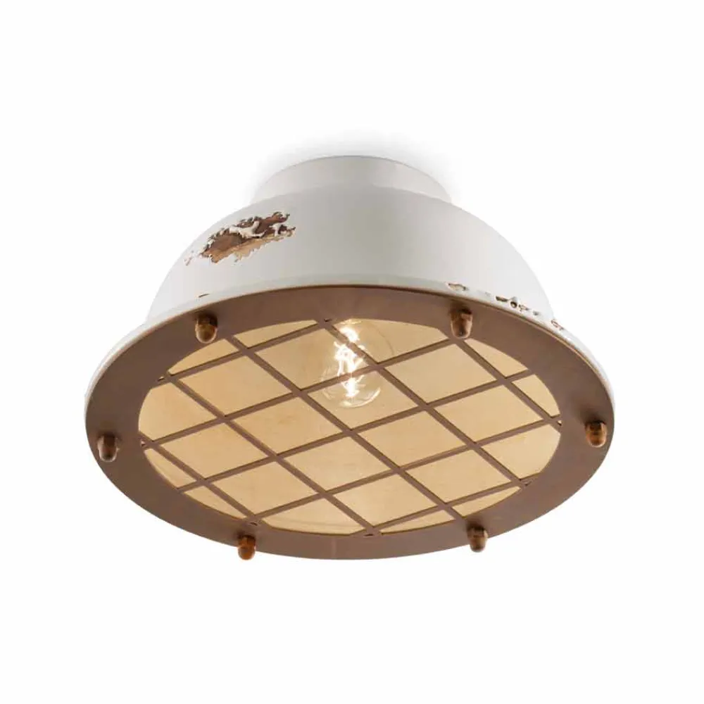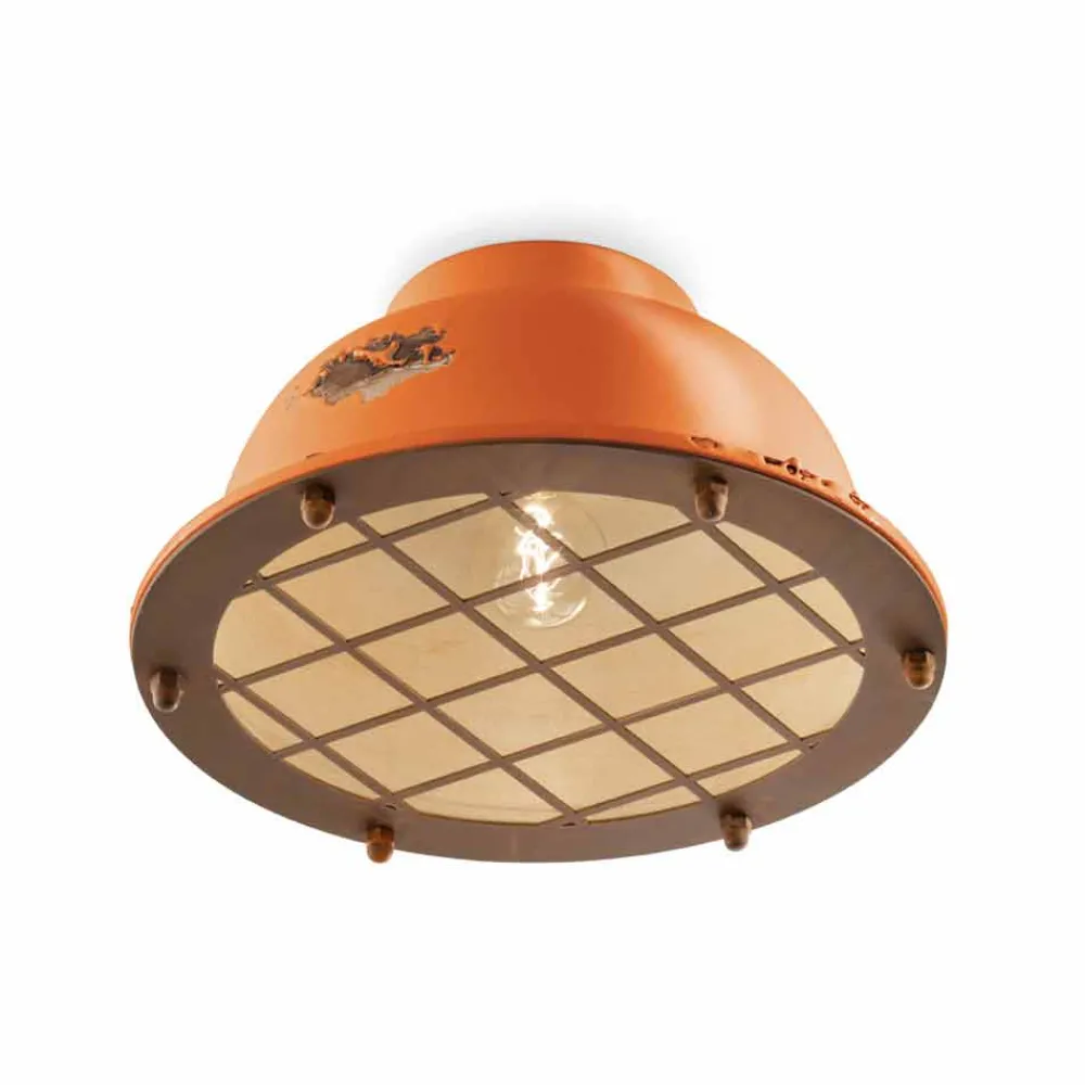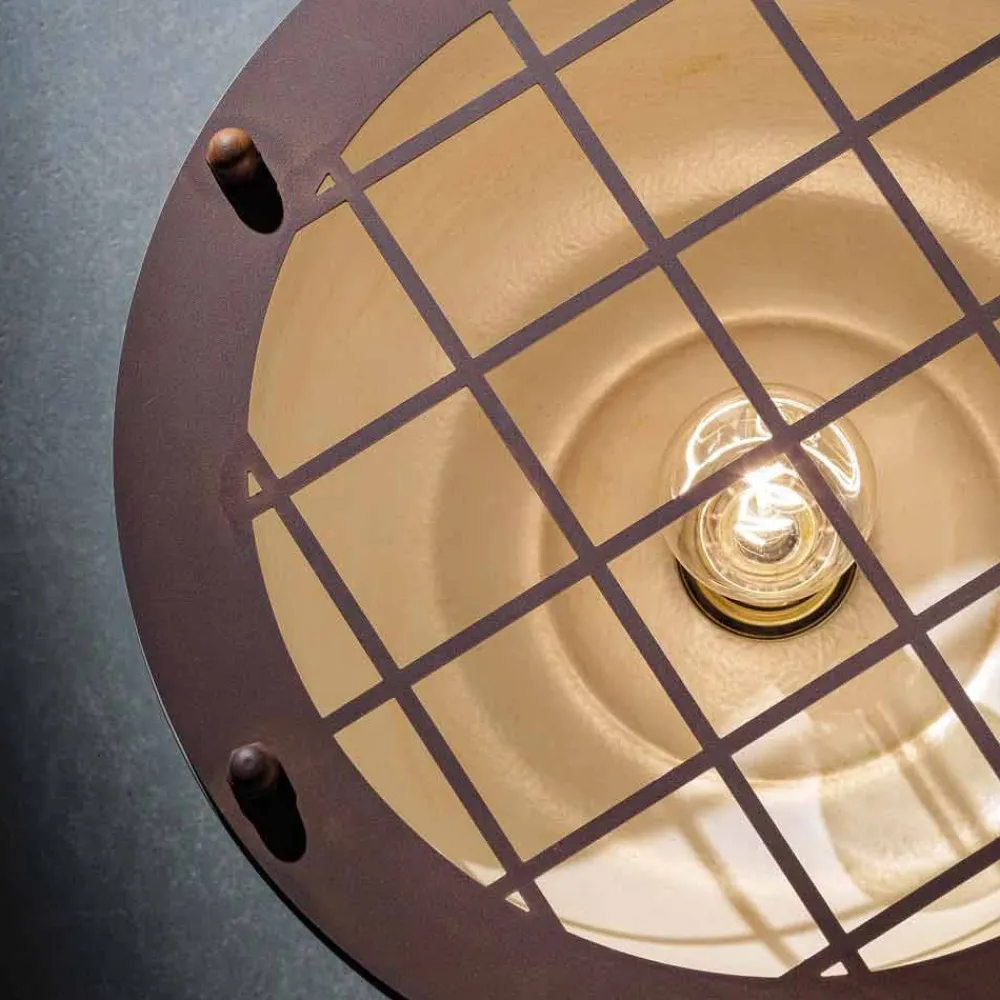 Eine weitere Besonderheit dieser fantastischen Lampe liegt in ihrem originellen Design, angefangen bei der Gitterabdeckung und den Befestigungsblindmuttern, beide in Corten-Finish. Diese kleinen Details machen diese Deckenleuchte im nautischen Stil zu einer unnachahmlichen Leuchte.