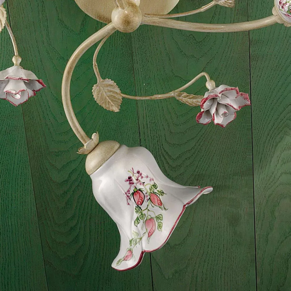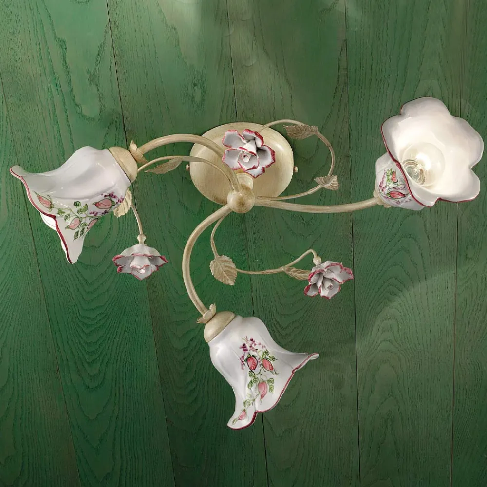 3-flammige Deckenlampe aus Metall und Keramik mit handgemalten Rosen, hergestellt in Italien von Ferroluce.
