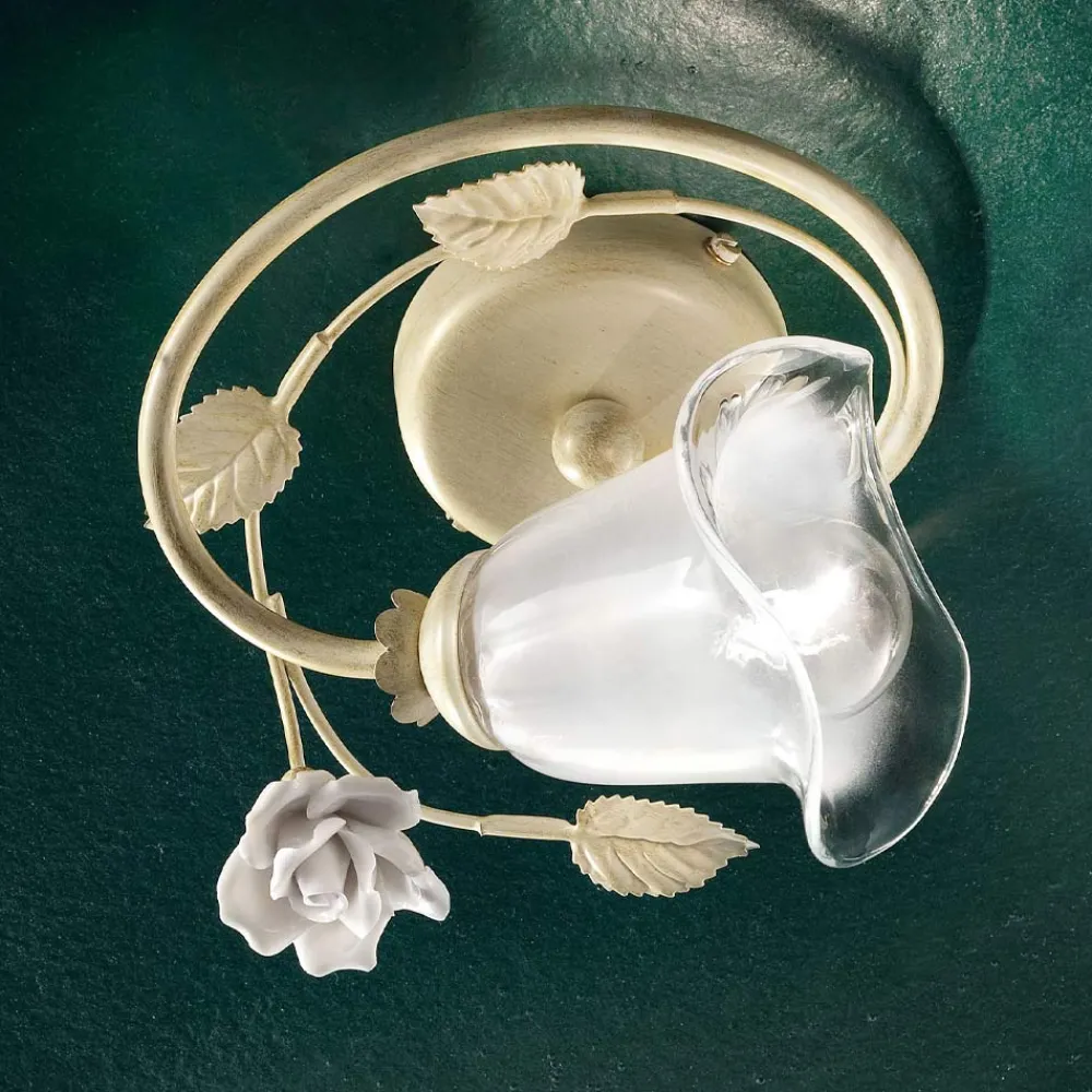 Deckenleuchte aus Eisen, Glas und Keramik mit Rosendekor, hergestellt in Italien von Ferroluce.
