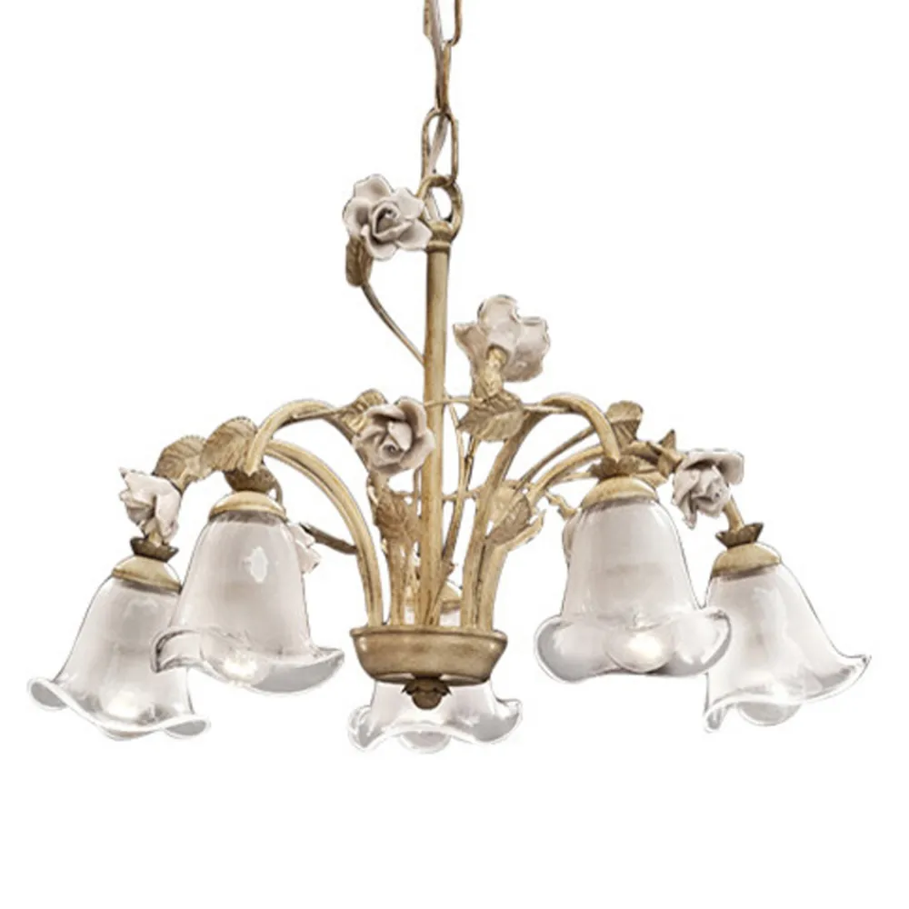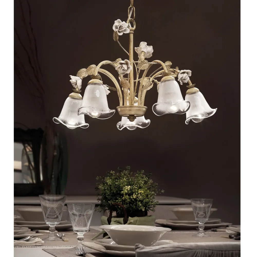 Dieser 5-flammige Kronleuchter besteht vollständig aus einer Metallstruktur , die an belaubte Zweige erinnert, und schattierten sandgestrahlten Glaslampenschirmen mit handgefertigten Dekorationen in Form von Keramikrosen . um das Geschick und die handwerklichen Fähigkeiten der Handwerker hervorzuheben.