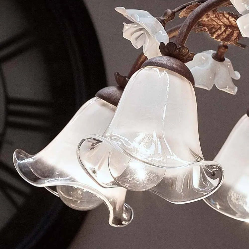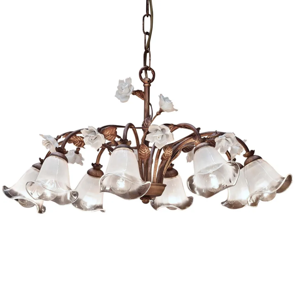 8-flammiger Kronleuchter aus Eisen, Glas und Keramik mit Rosendekor, hergestellt in Italien von Ferroluce.