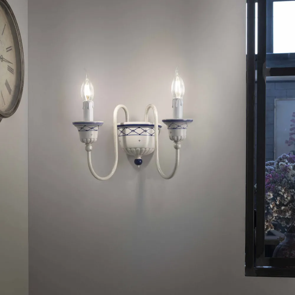 Diese 2-flammige Wandlampe ist vollständig handgefertigt aus bemaltem Messing und Keramik mit handgemalter Blumendekoration, um die Handwerkskunst und die handwerklichen Fähigkeiten der Handwerker hervorzuheben.