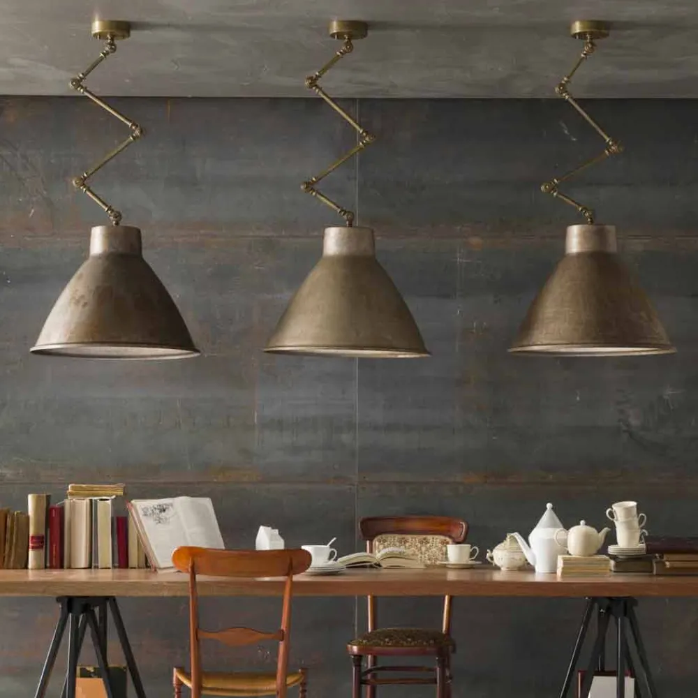 Pendelleuchte aus patinierten Eisen im Industrie Style. Die Hängelampe zeichnet sich vor allem durch Ihr robustes Auftreten und Ihre ästhetischen Eigenschaften aus. Der Industrie Chic Style überzeugt mit seinen Mix aus kaltem patinierten Eisen und die außergewöhnliche Handwerkskunst. Der optsiche Mix aus kalten Eisen und warmen Lichtstrahlen verleihen der Atmosphäre seinen außergewöhnlichen zeitlosen Touch. Der Schwenkarm besteht aus Messing und ist individuell in der Höhe oder der Richtung einstellbar.