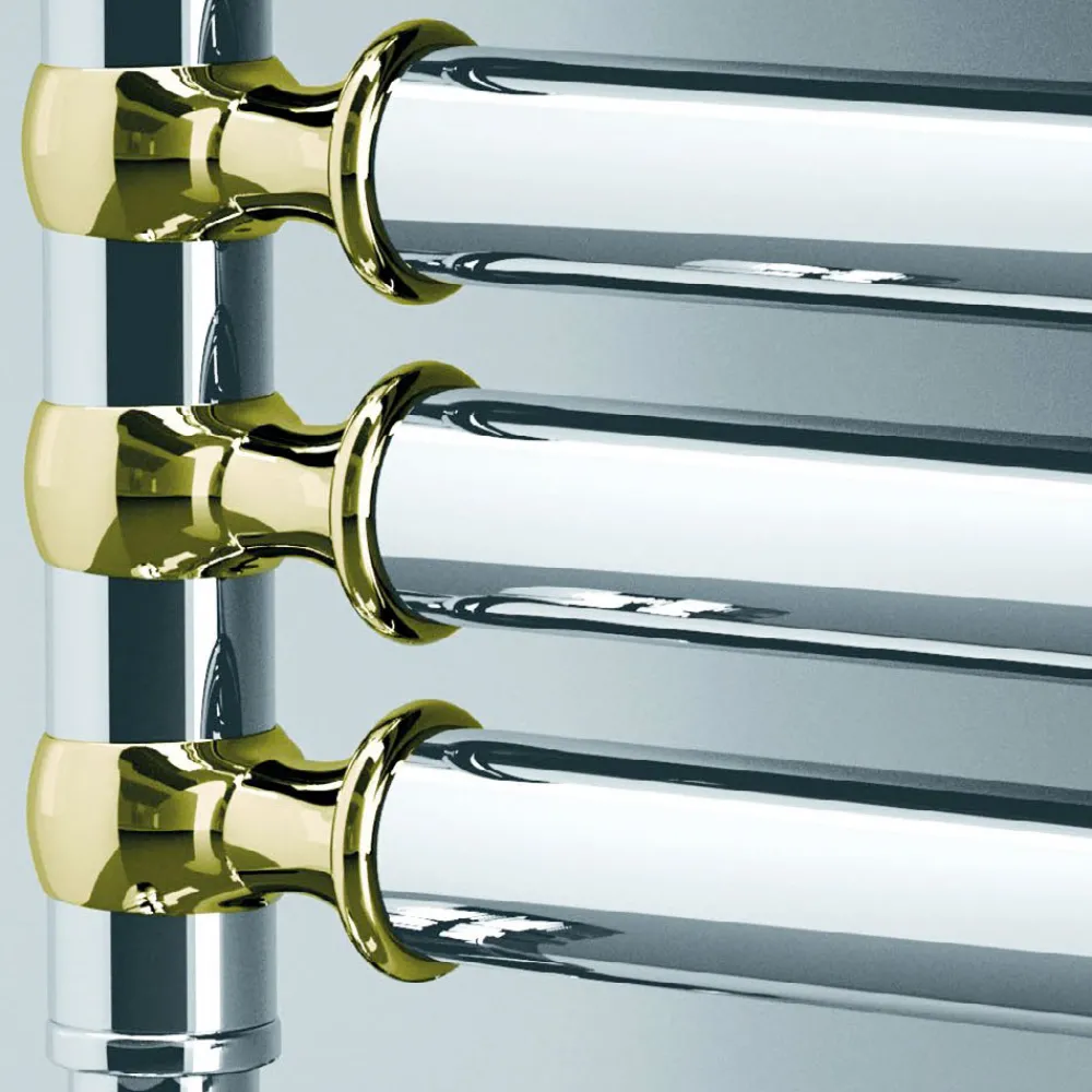 Dieser anspruchsvolle Stahlheizkörper ist die Definition von Eleganz und Funktionalität. Das schlanke Design und die zahlreichen horizontalen Linien optimieren nicht nur die Wärmeverteilung, sondern bieten auch eine praktische Lösung als Handtuchhalter . Die Kombination aus poliertem Stahl mit goldenen Details verleiht einen Hauch von Wärme und Luxus und macht ihn zu einer perfekten Ergänzung für moderne oder klassische Badezimmer.