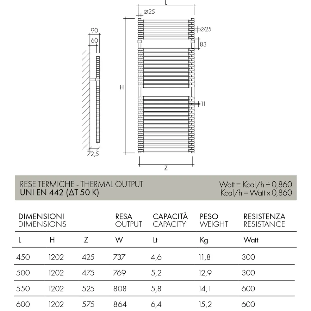 - Länge: 60 cm x Tiefe: 9 cm x Höhe: 120,2 cm – Leistung: 864 W – Gewicht: 15,2 kg – Widerstand: 600 Watt – Fassungsvermögen: 6,4 lt