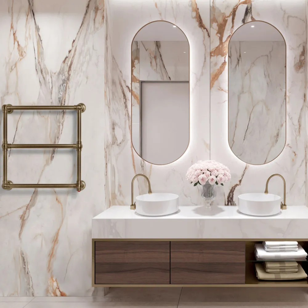Die Oberfläche verleiht eine einzigartige Wärme und zeitlose Eleganz und passt wunderbar zu Marmorwänden und modernem Badezimmerdekor. Ihre Präsenz ist subtil und doch deutlich und verleiht einen Hauch von Luxus , ohne andere dekorative Elemente zu überwältigen.