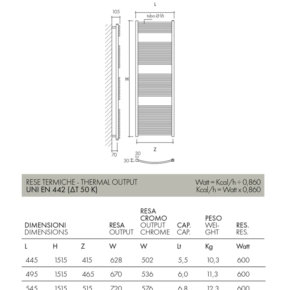- Länge: 54,5 cm x Tiefe: 10,5 cm x Höhe: 151,5 cm – Leistung: 720 W – Gewicht: 12,3 kg – Widerstand: 600 Watt – Fassungsvermögen: 6,8 lt