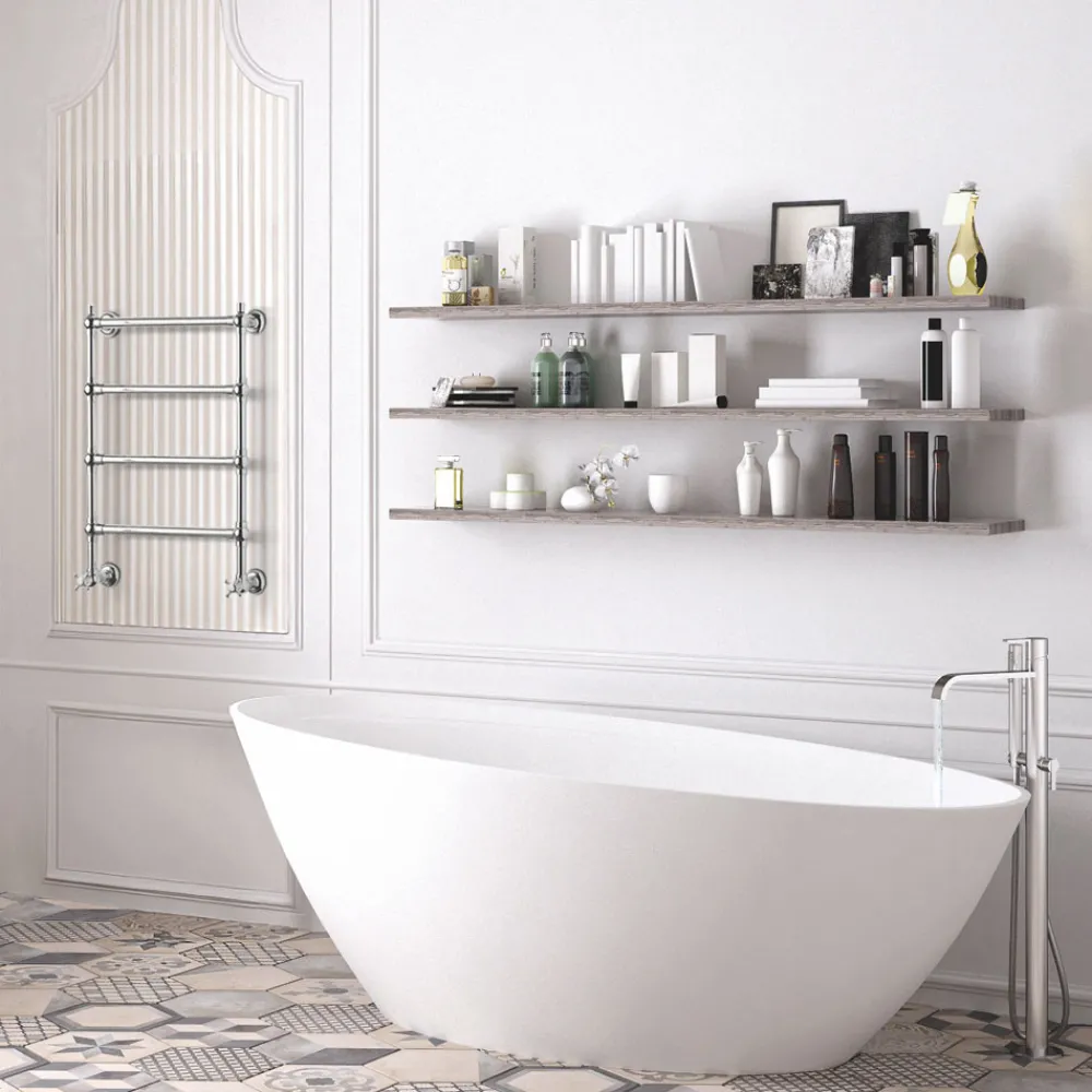 Das minimalistische Design und die Chromoberfläche passen perfekt zu klassischen oder zeitgenössischen Inneneinrichtungen, wie dieses elegante Badezimmer zeigt, in dem sich der Heizkörper harmonisch zwischen die weißen Wände und den raffiniert dekorierten Boden einfügt. Seine diskrete und dennoch elegante Präsenz bereichert die Umgebung, ohne optisch zu überladen, und verleiht ihr einen Hauch von modernem Stil .