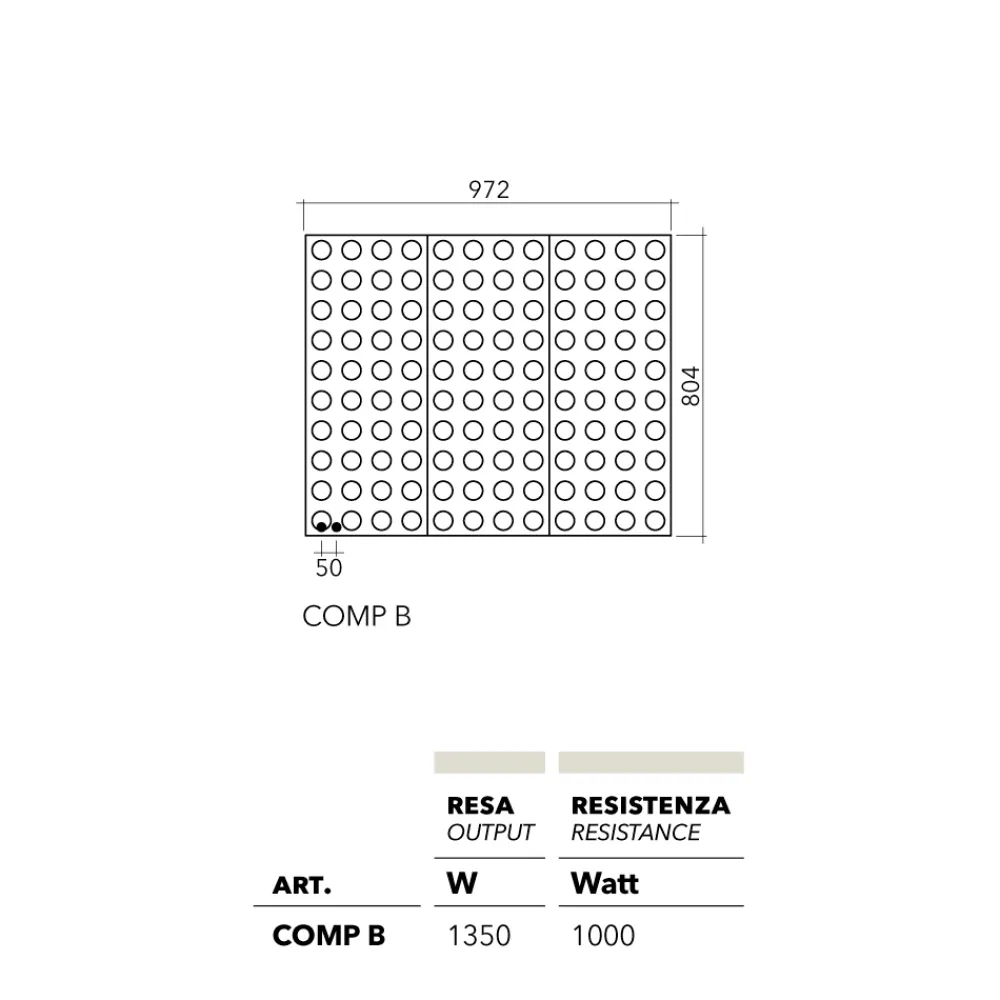 | Maße | L. 972 mm, H. 804 mm, Achsabstand 50 mm; Wärmeleistung 1350 Watt |